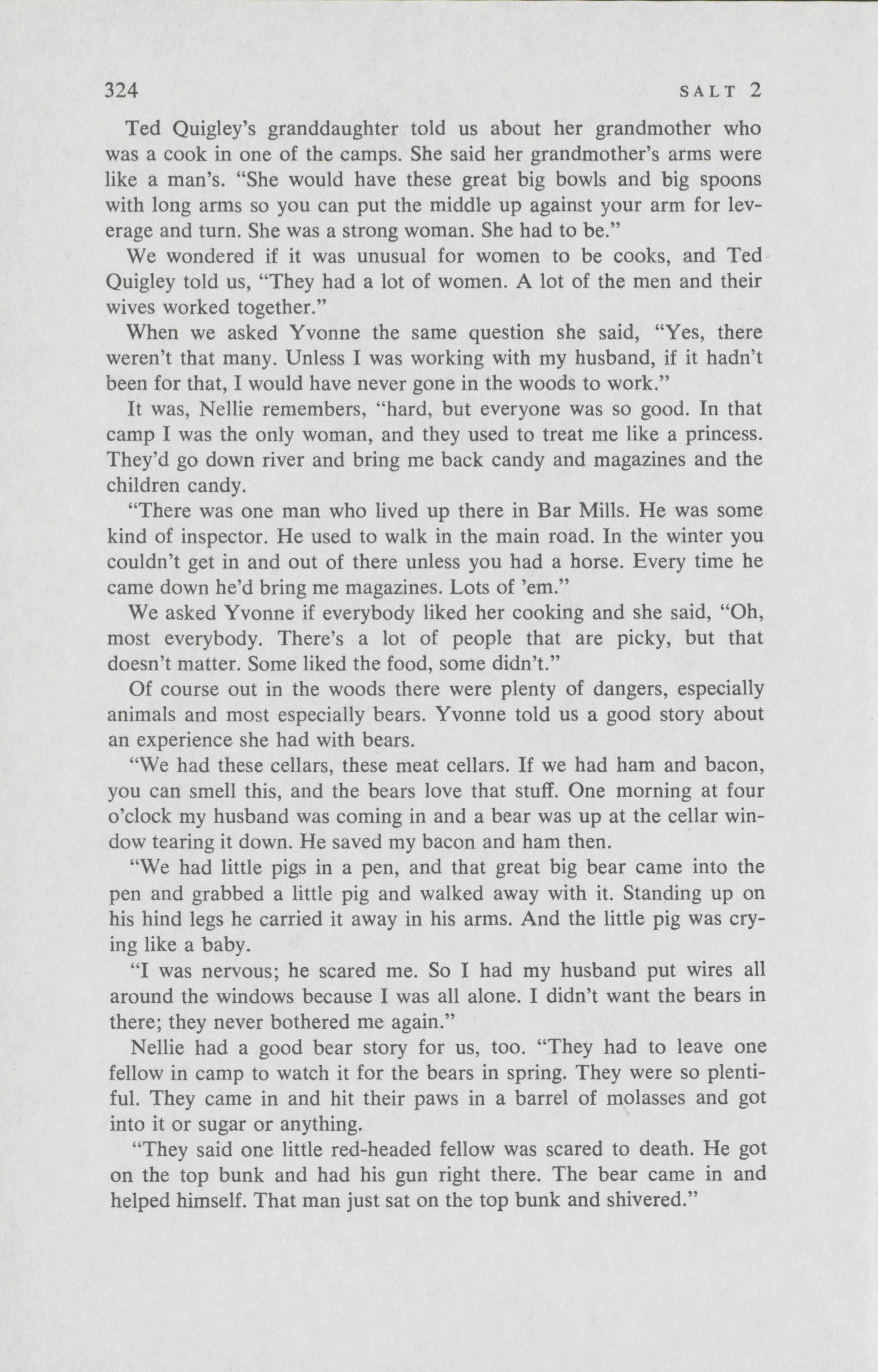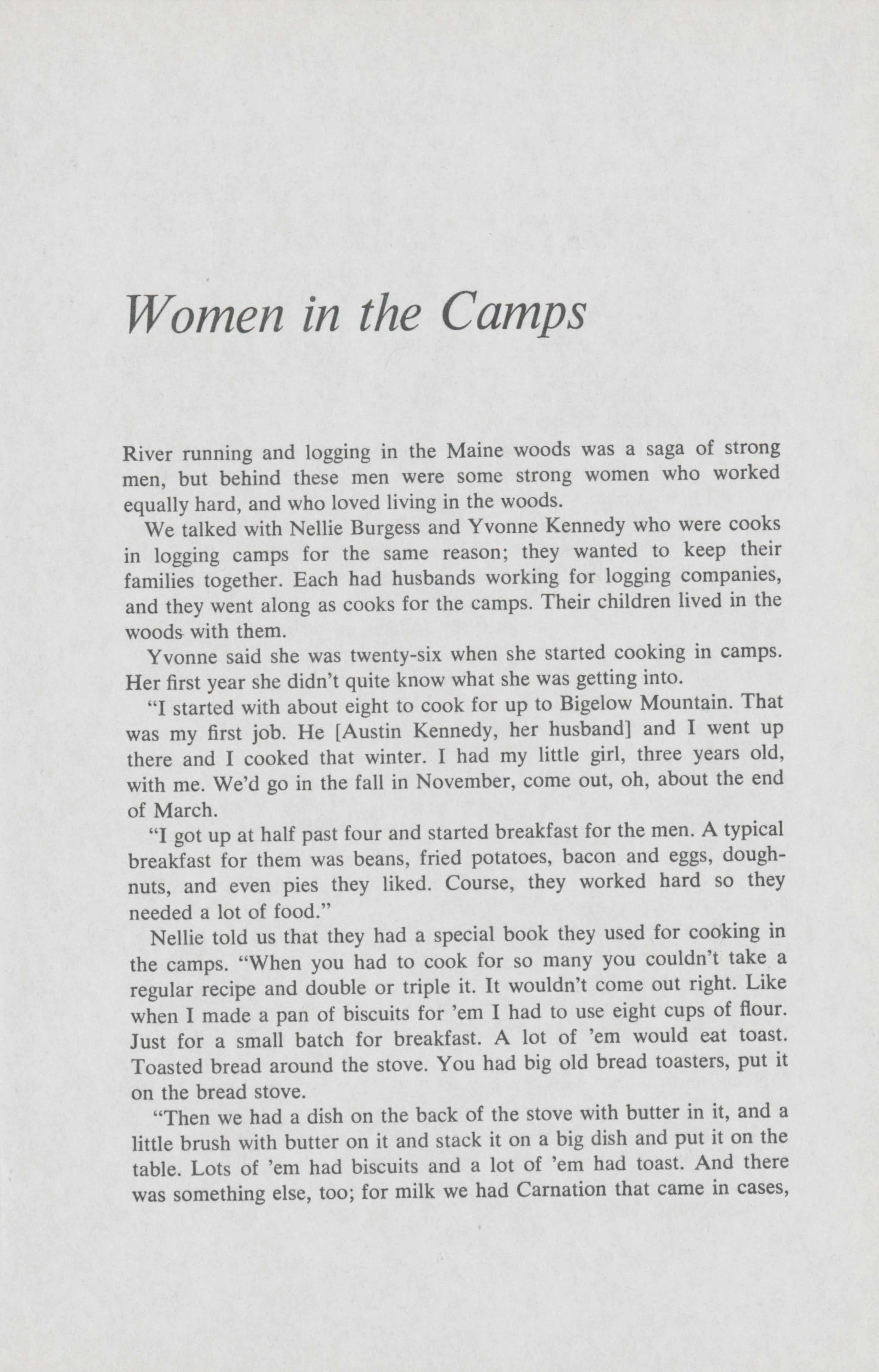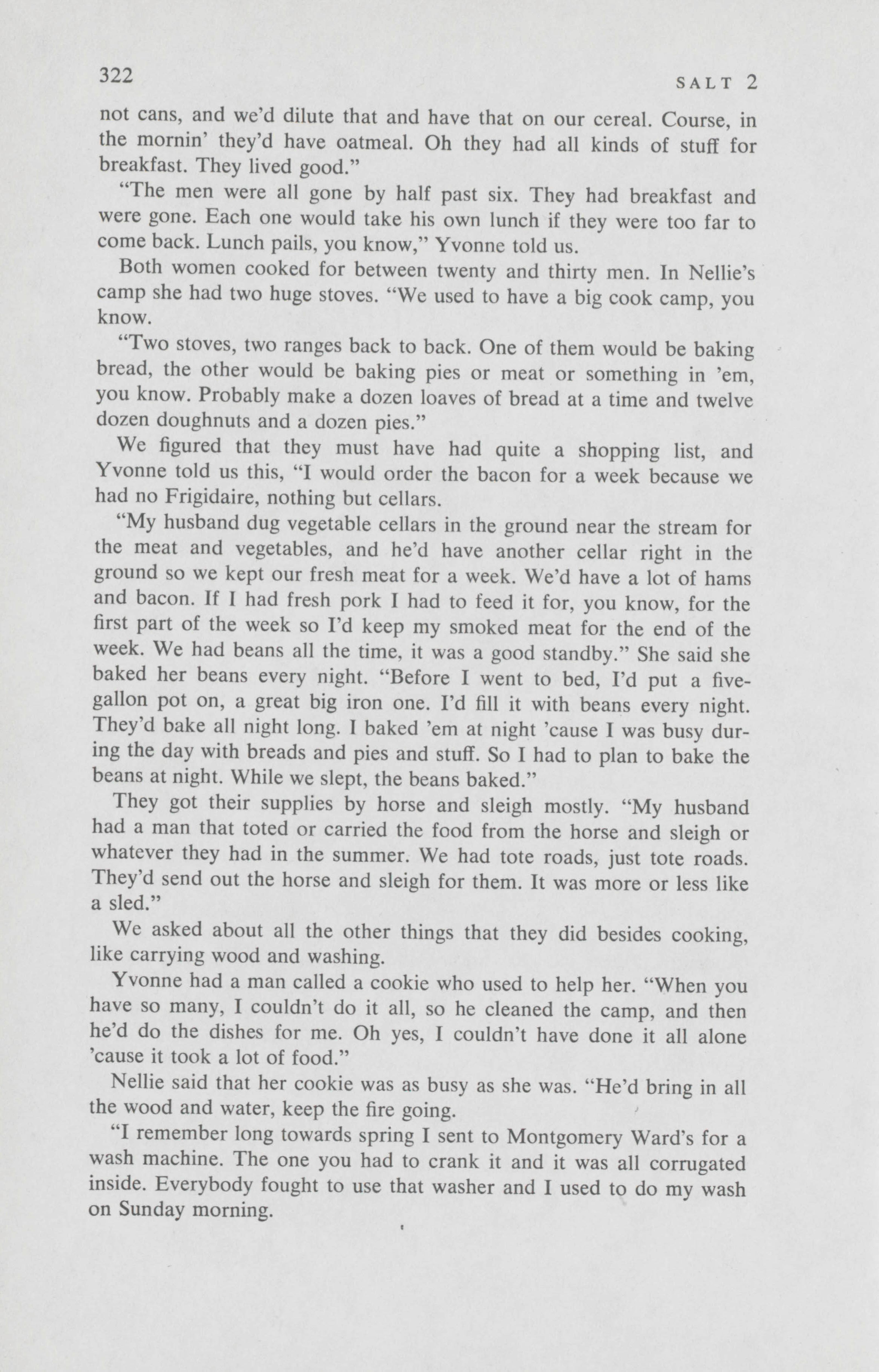 Salt explores how women at logging camps spend their time, and the hard work they do.