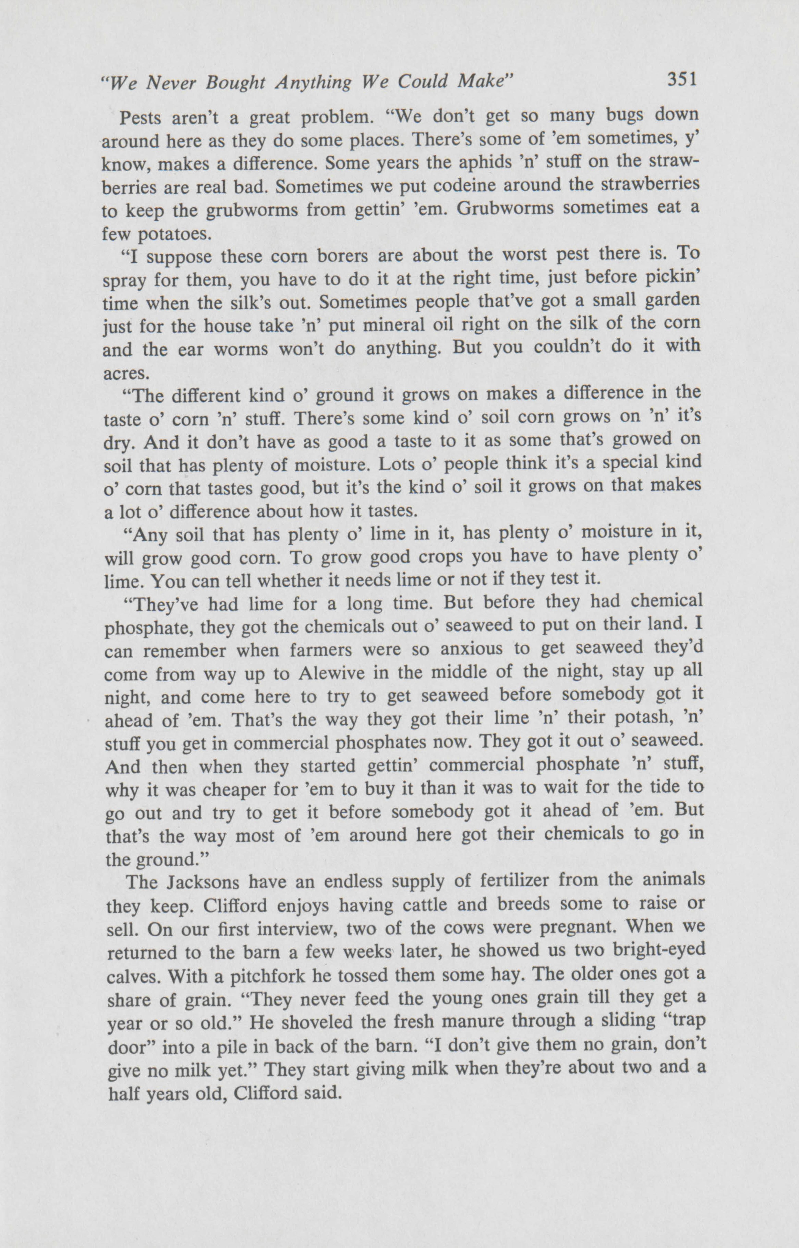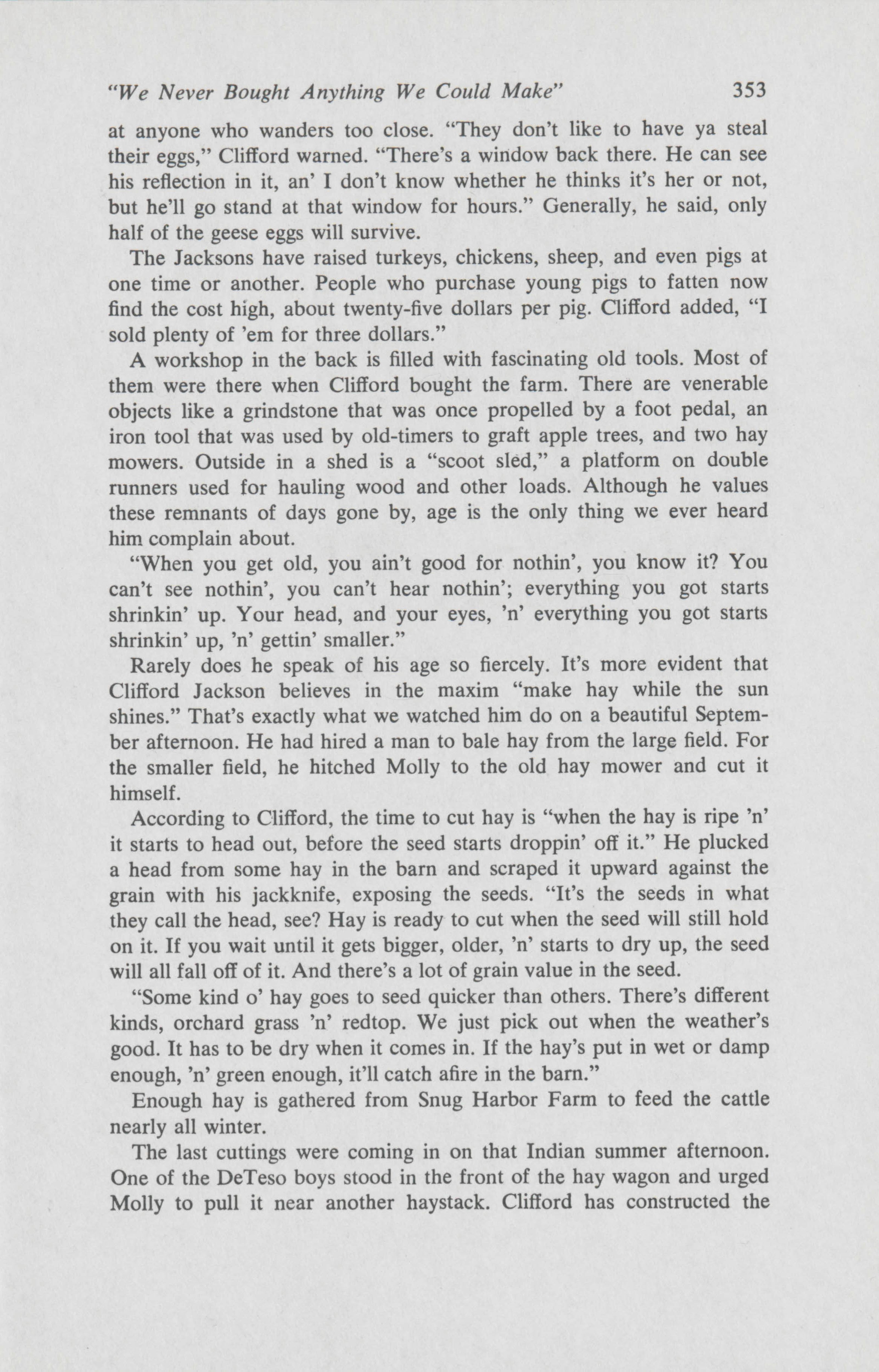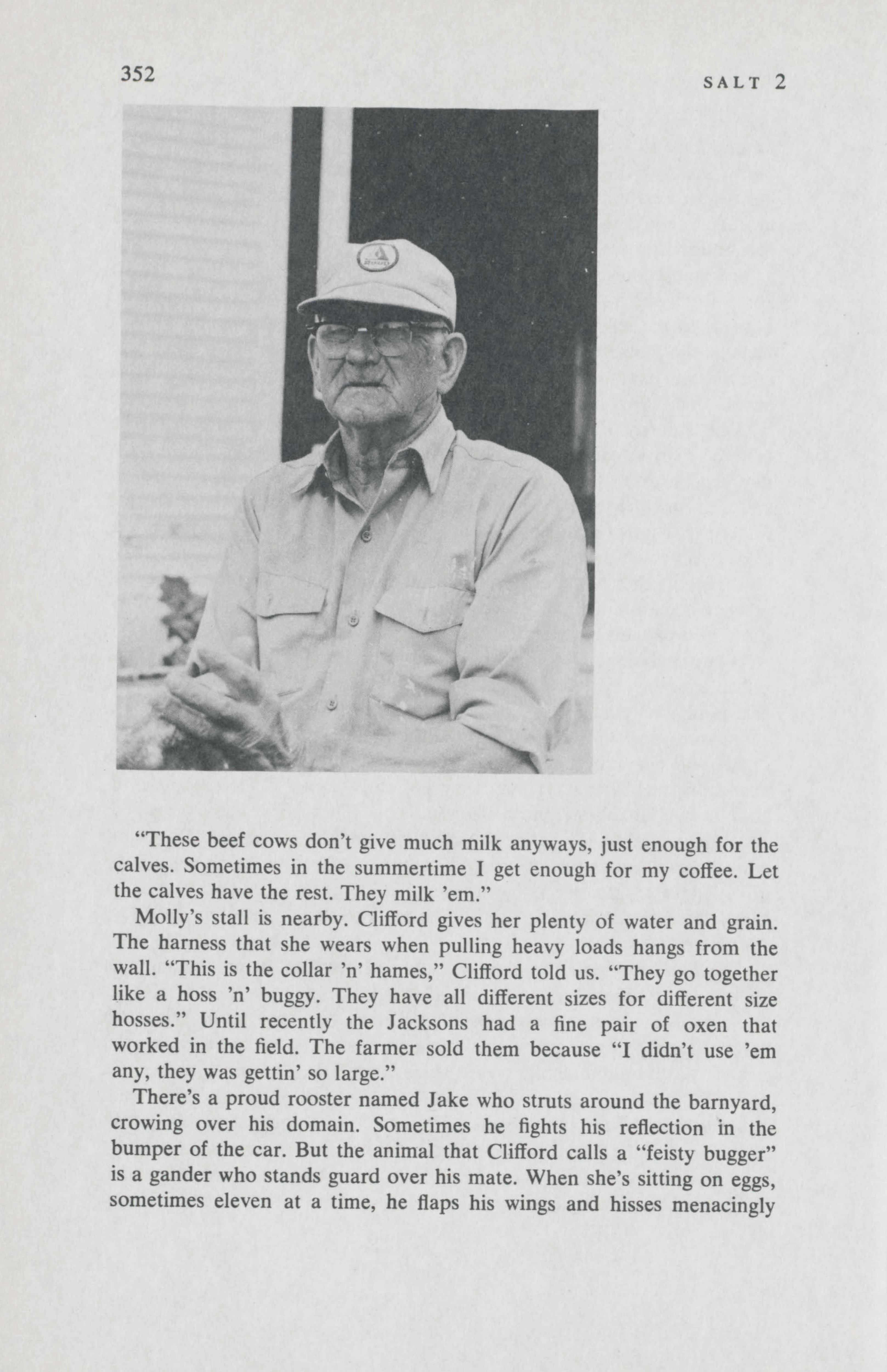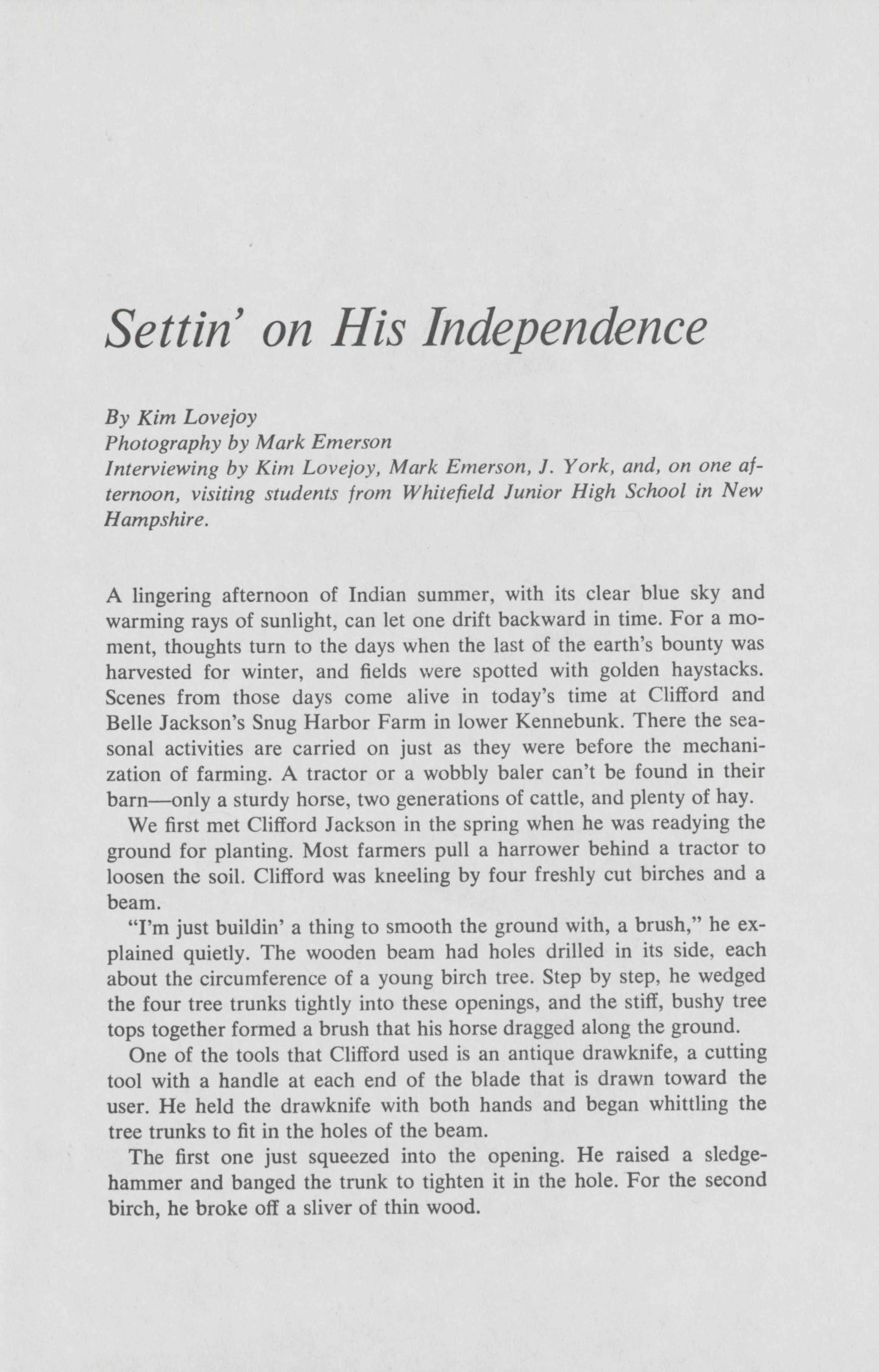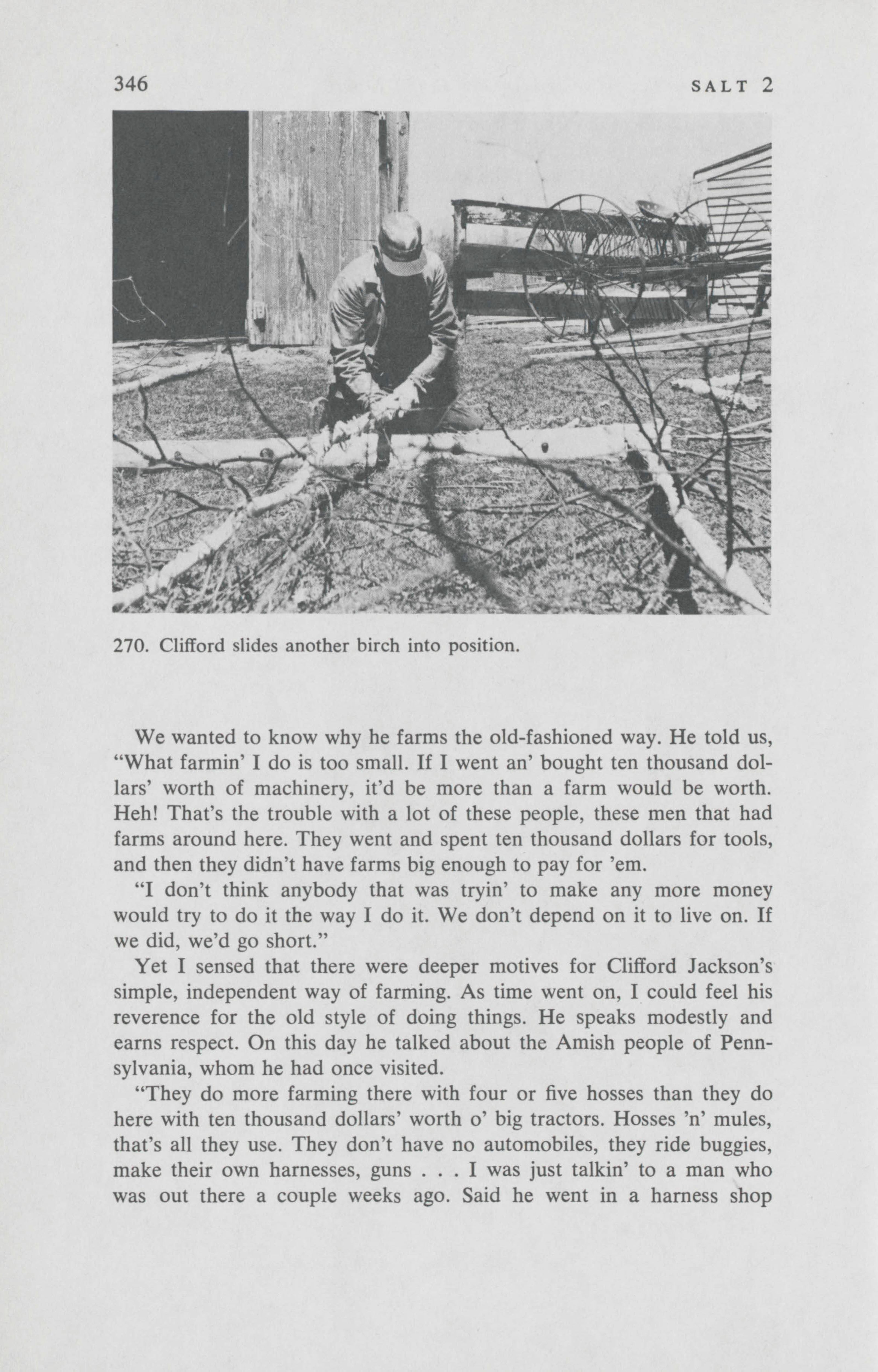Following a tradition of farm work before mechanized farming, Clifford and Belle Jackson continue to farm the old way. Kim Lovejoy documents the activities that the Jackson's perform on their farm to retain old farming habits.