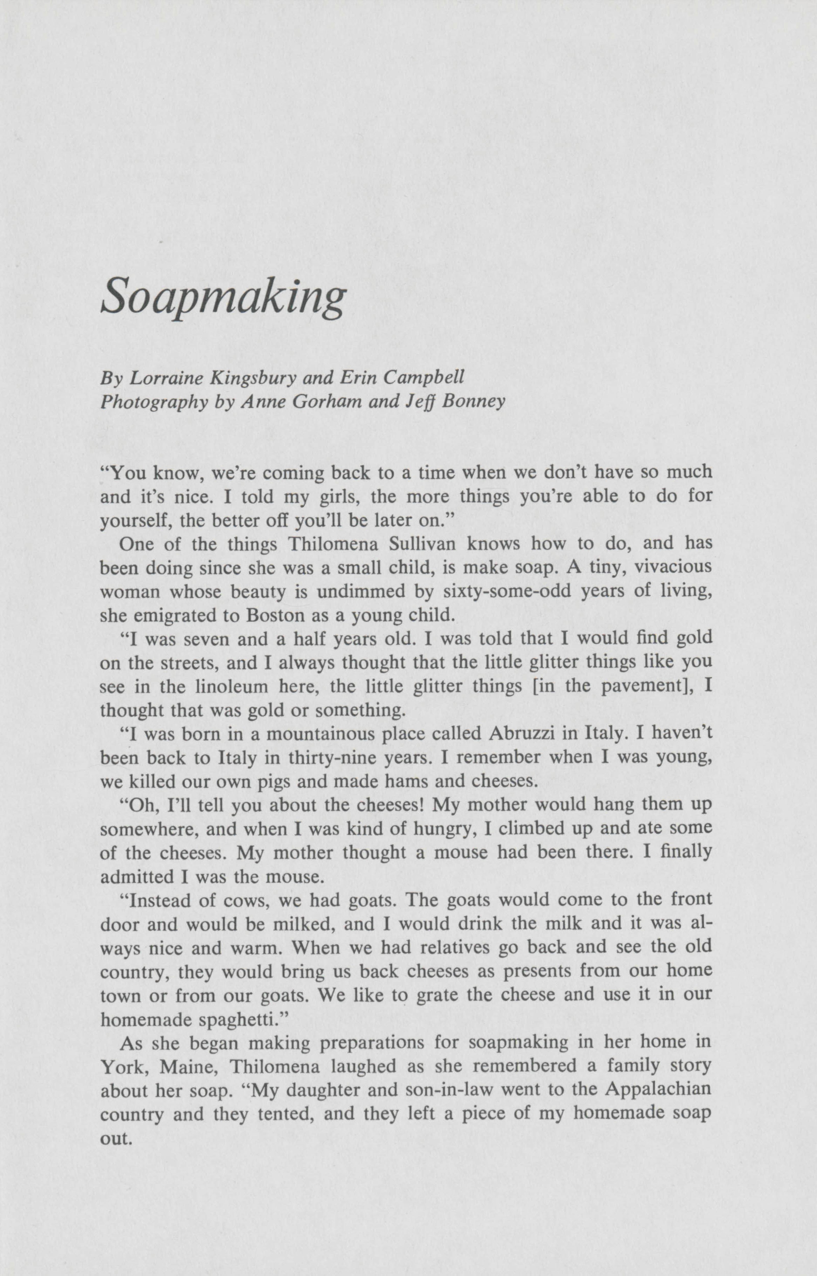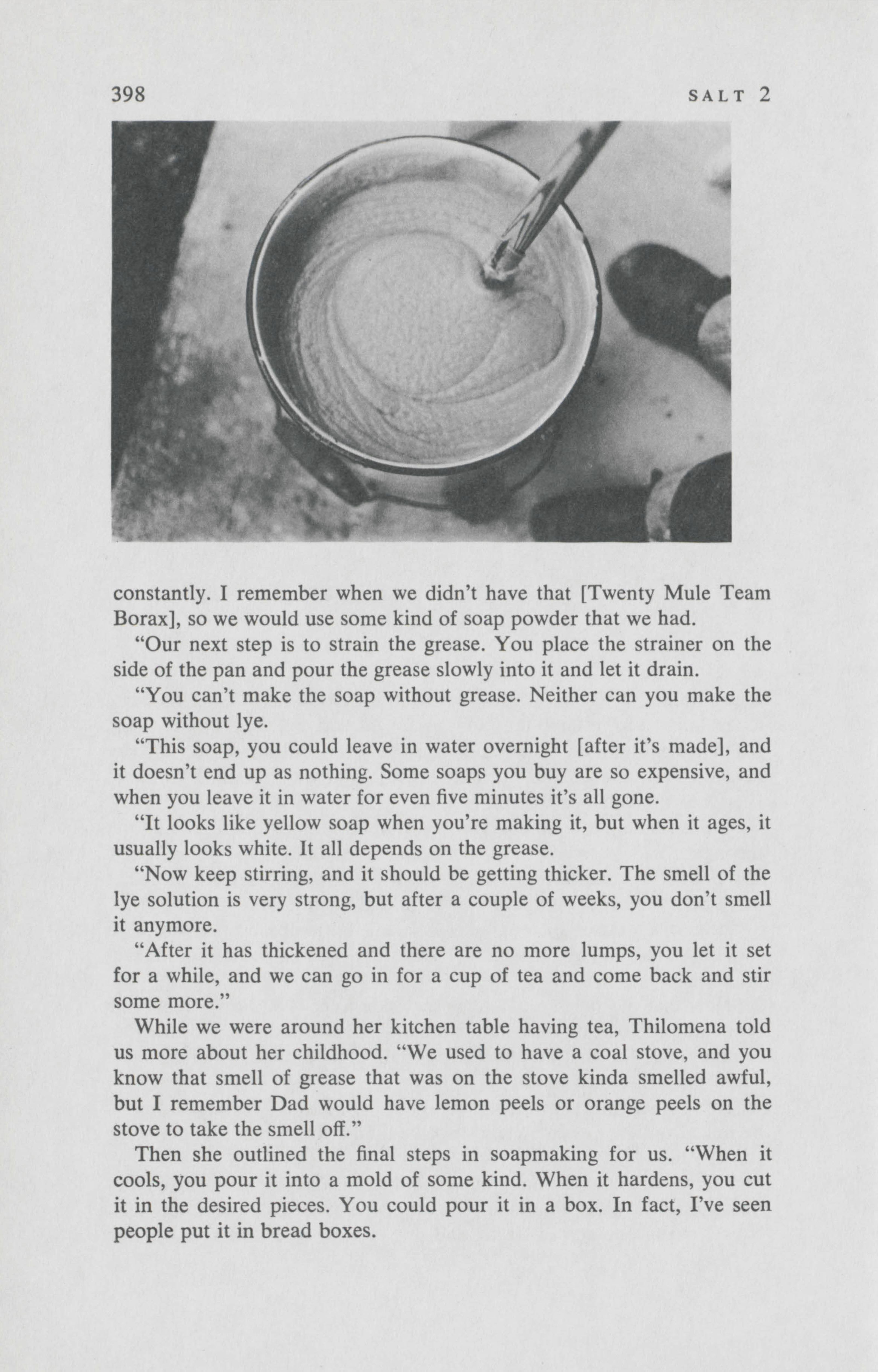 Making soap all of her life, Mrs. Joseph Sullivan shows Salt students how her craft is performed. Mrs. Sullivan guides Lorraine Kingsbury and others through the process from the start.