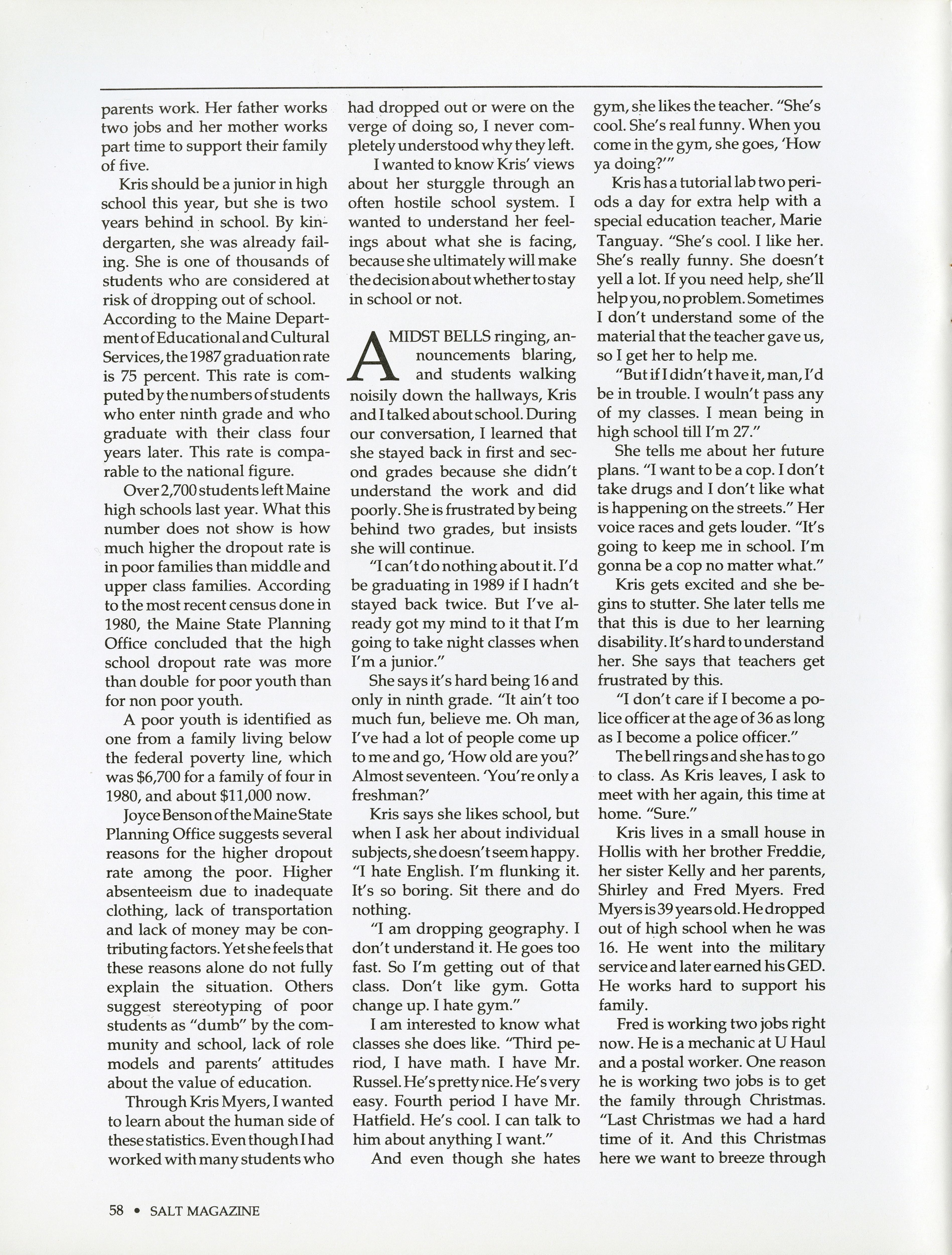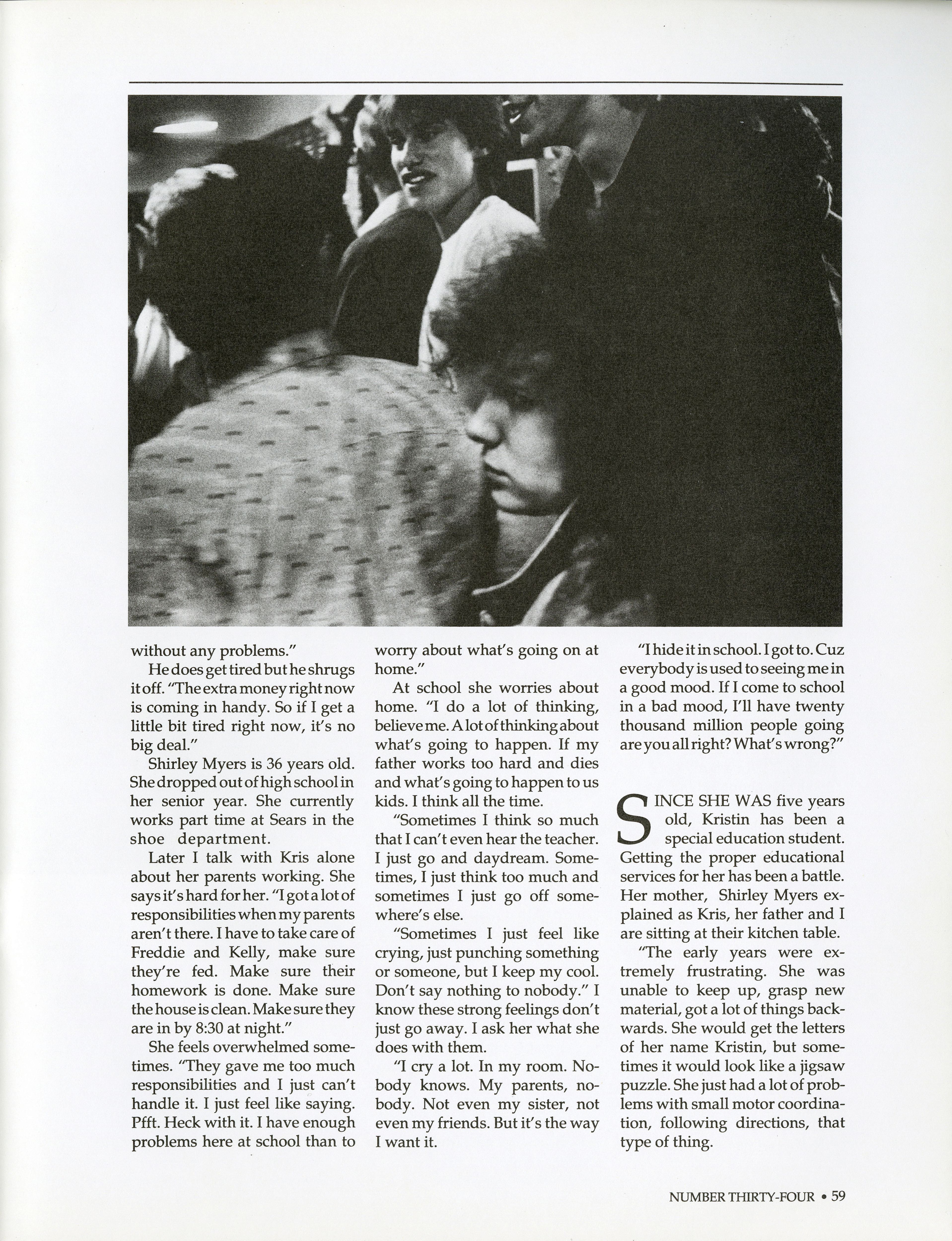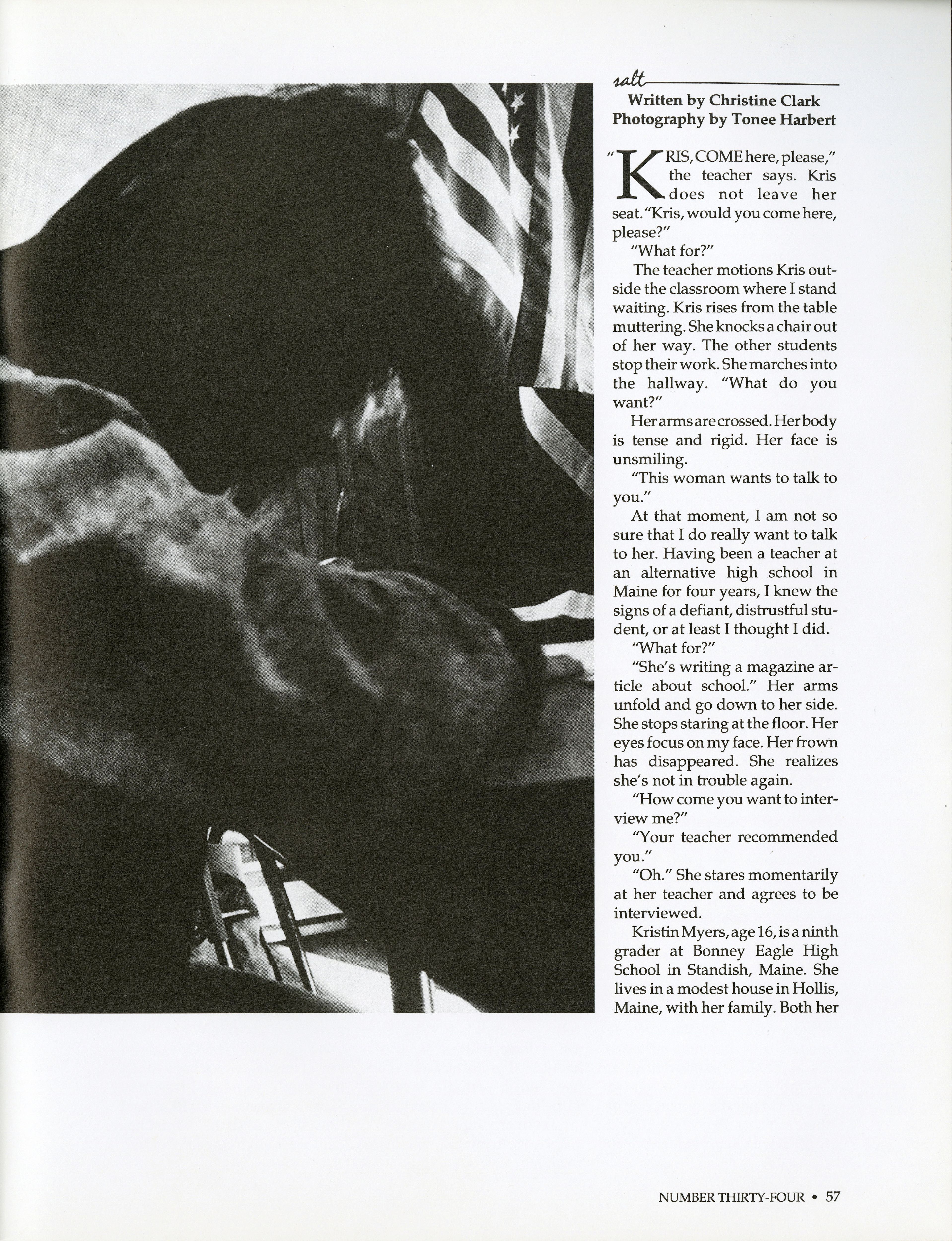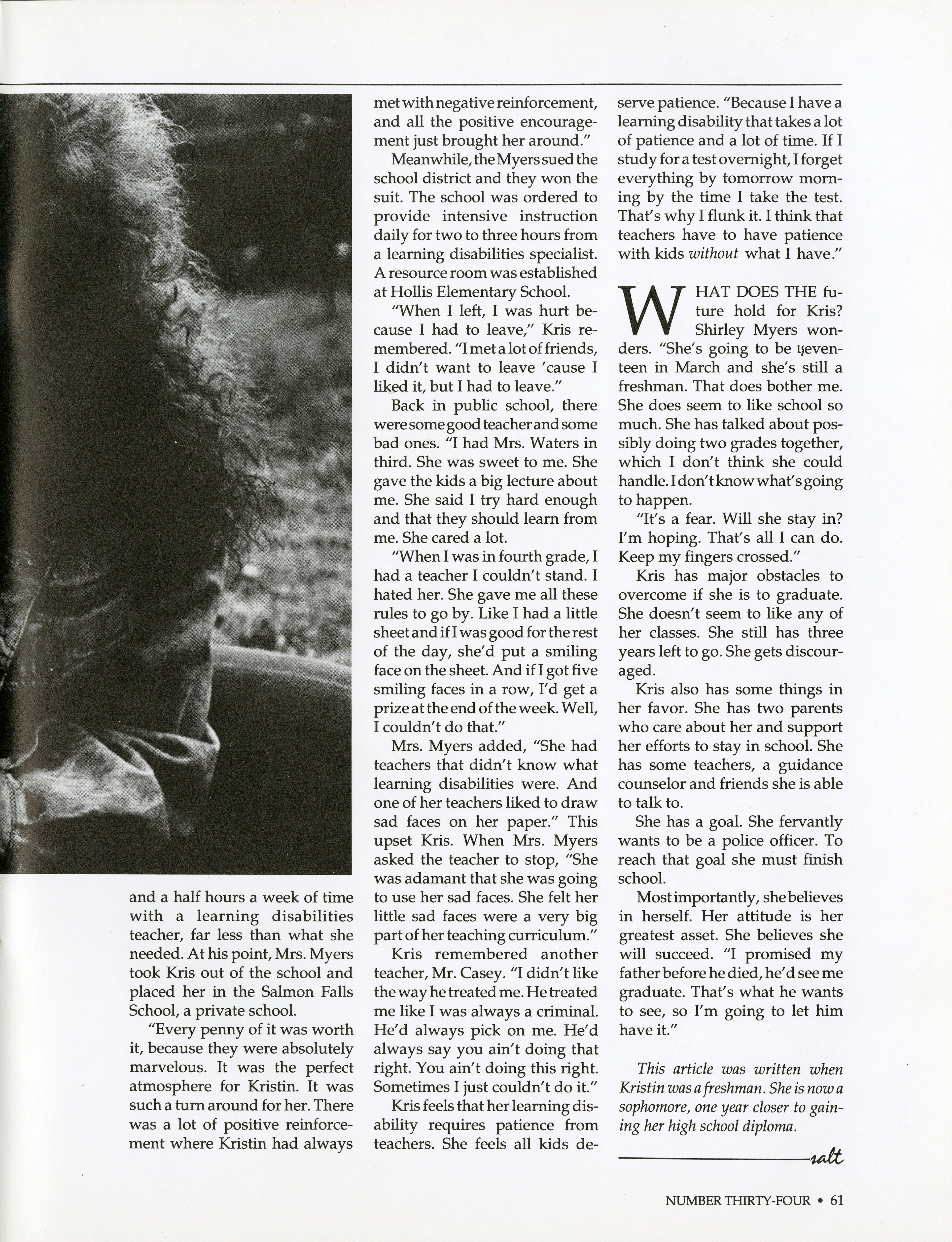 At risk of flunking out from school systems, Kristin Myers is an at-risk student. Christine Clark documents how Myers struggles in school and the impact it has on her life.
