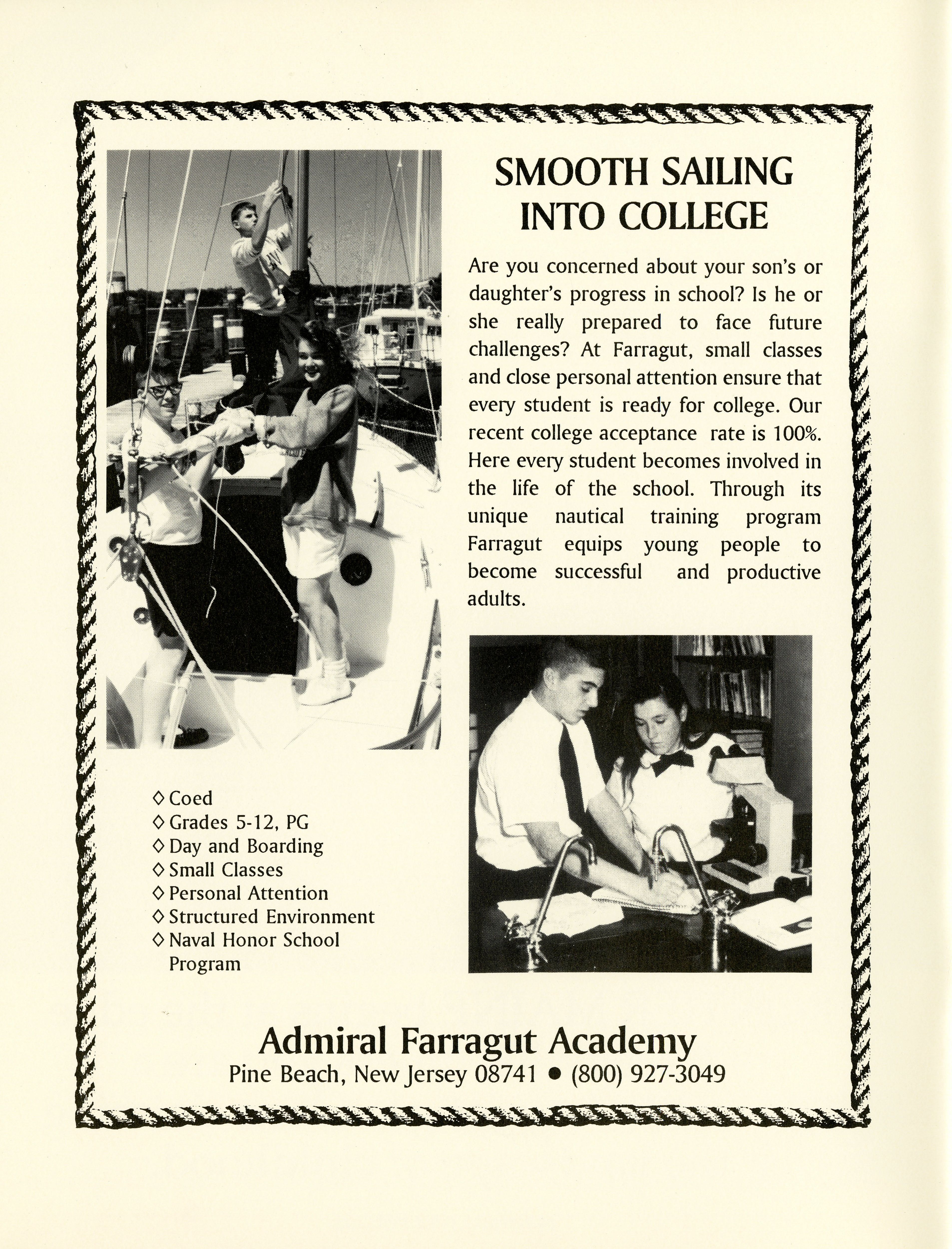 Inside front cover for the August 1993 Salt Magazine, with advertisement for Admiral Farragut Academy.