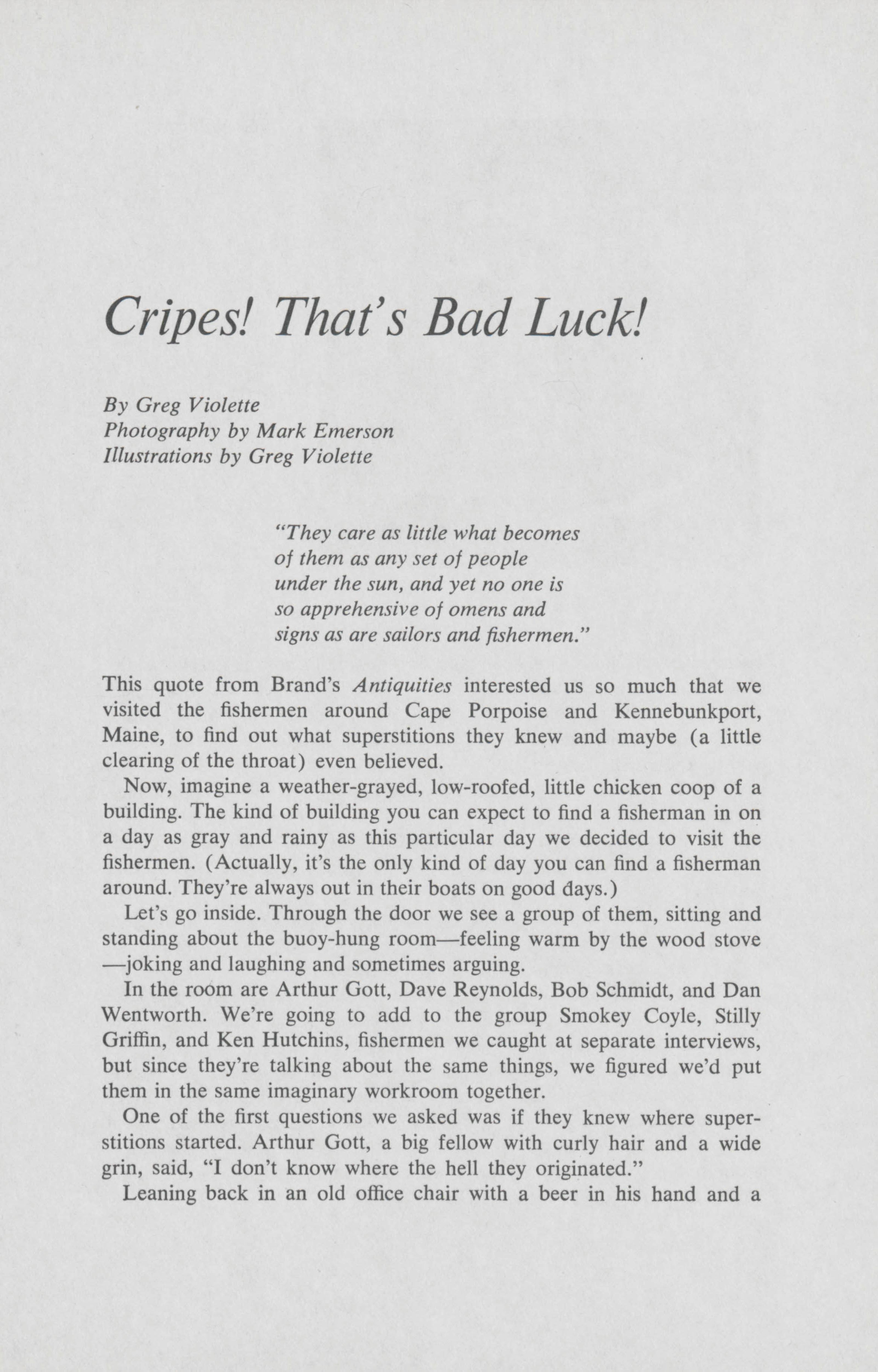 With a quote on fisherman in hand, Greg Violette decided to speak to fisherman around Cape Porpoise and Kennebunkport. Violette discusses superstitions that fisherman may have and how it shapes their experiences.