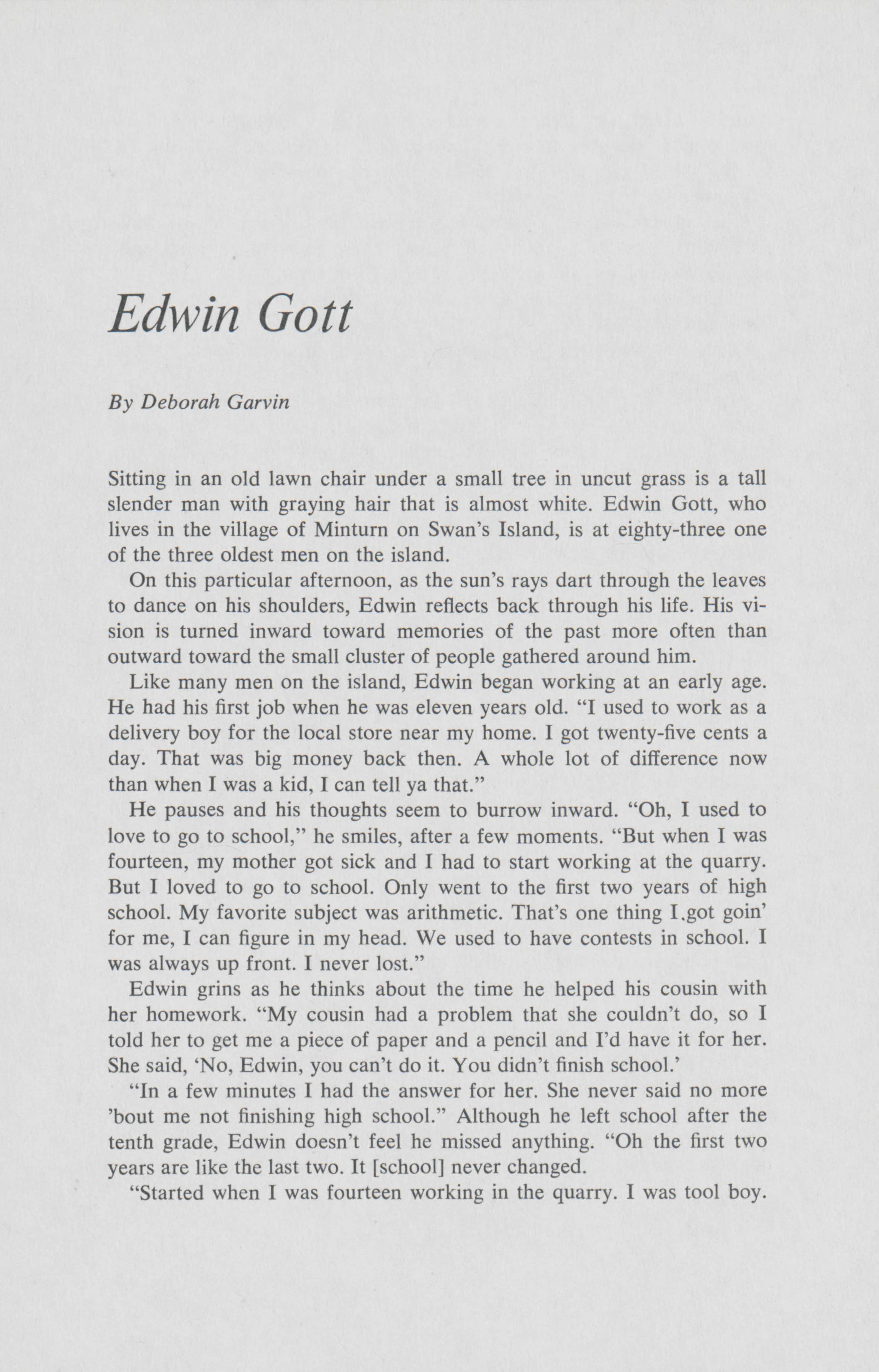 Living on Swan's Island for over 83 years, Edwin Gott finds it almost like a dream. Deborah Garvin speaks to Gott about his experiences on the island.