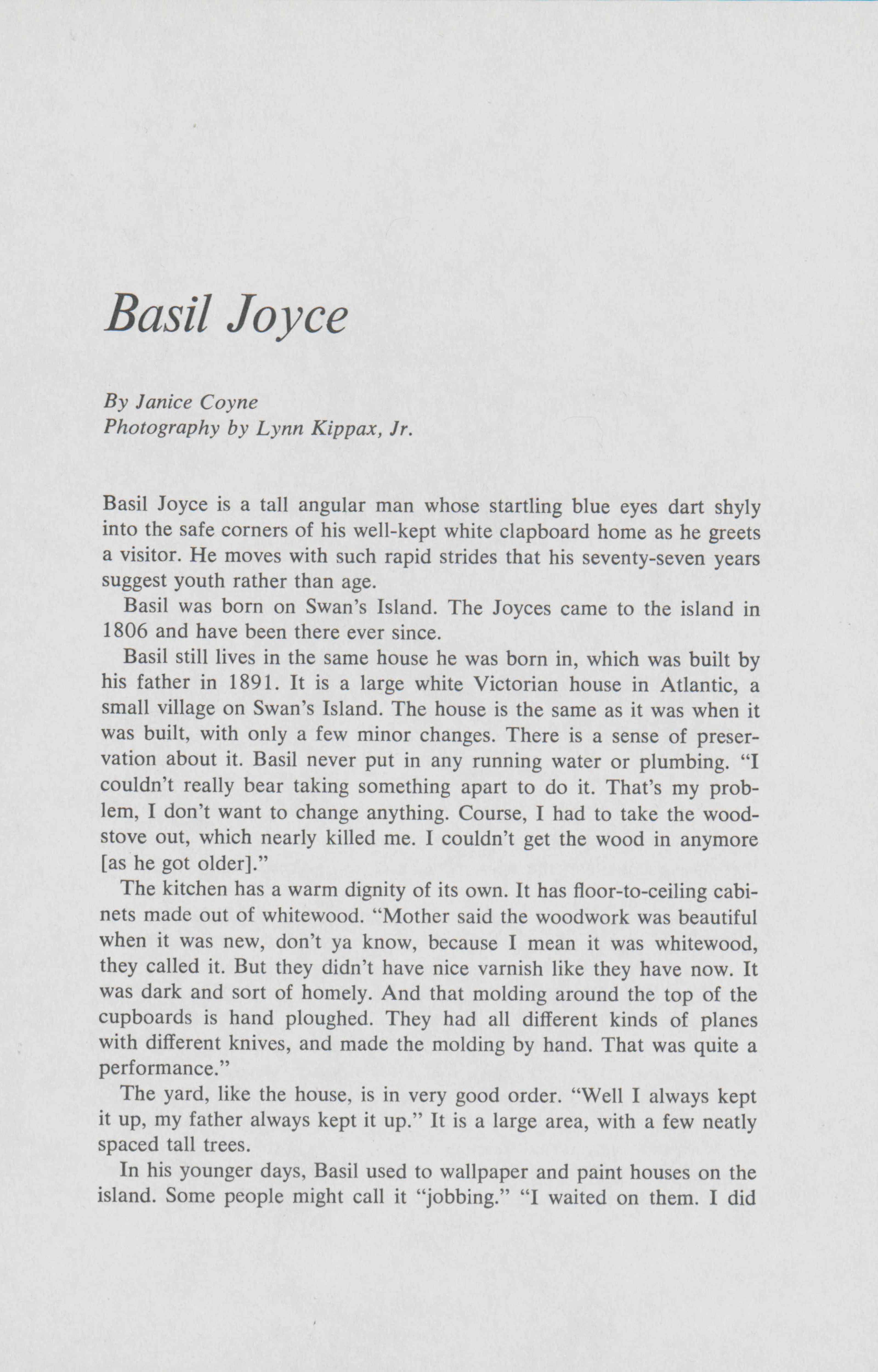 Living in the home that his father build on Swan's Island, Basil Joyce sees his life as an island on its own. Janice Coyne speaks to Joyce about life on the island.