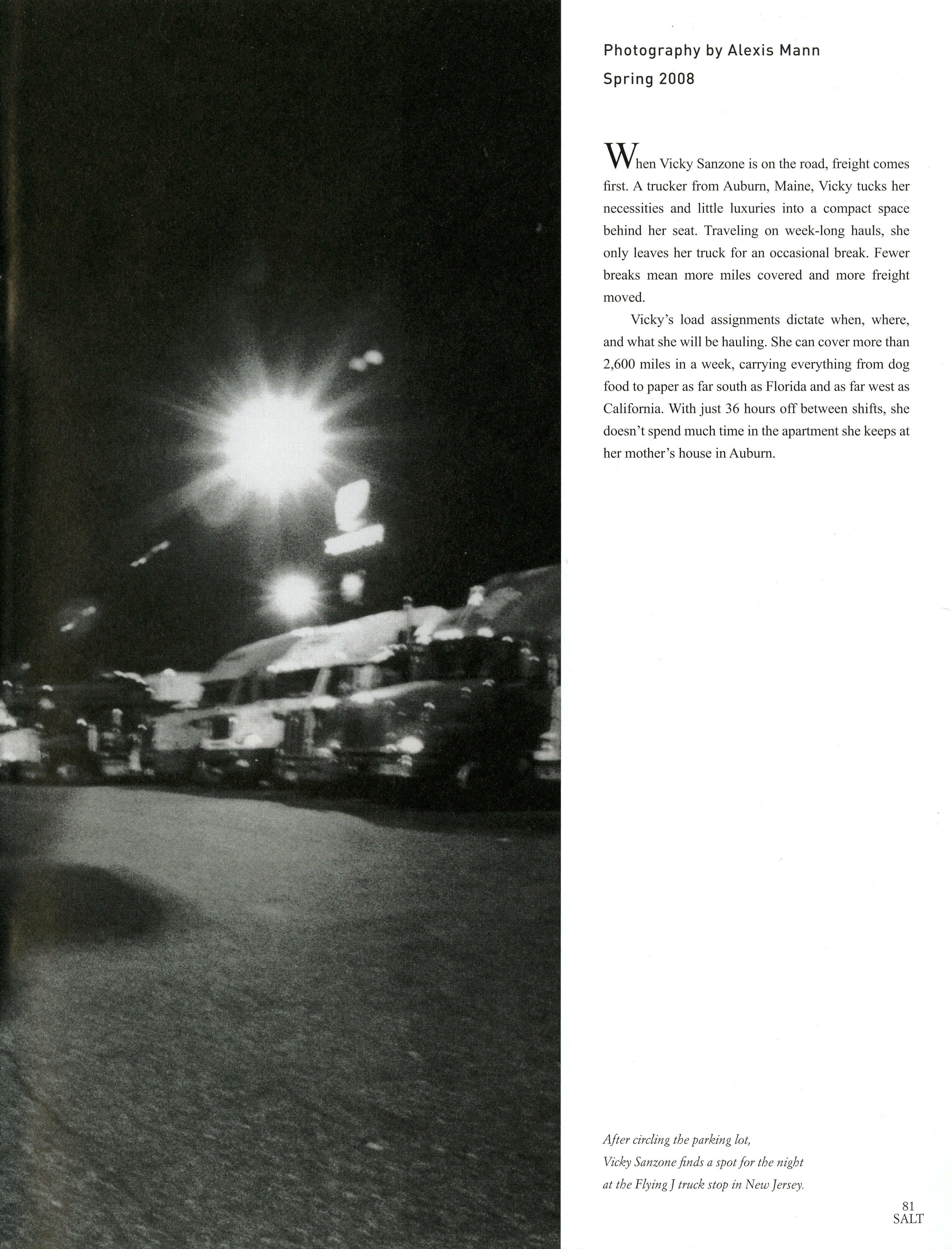Alexis Mann captures the work and life of Vickey Sanzone, a trucker from Auburn, Maine, who can cover more than 2,600 miles in a week.