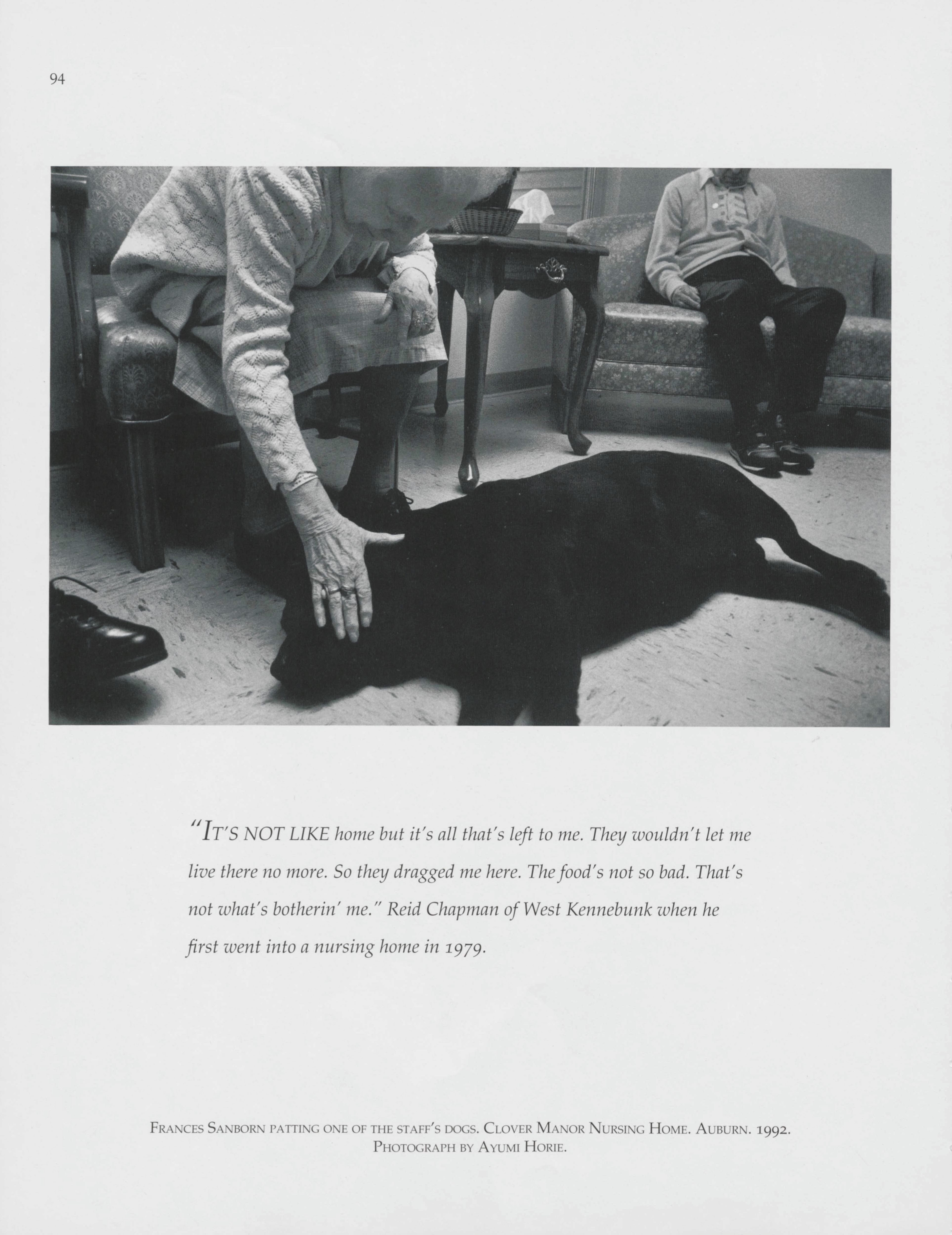 Ayumi Horie takes a photograph of Frances Sanborn petting a dog at Clover Manor Nursing Home.