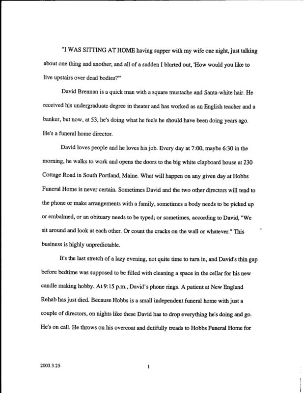 Mira Ptacin highlights the work of David Brennan, a funeral home director at Hobbs Funeral Home. Ptacin speaks to Brennan about his profession and the various job functions at a funeral home.