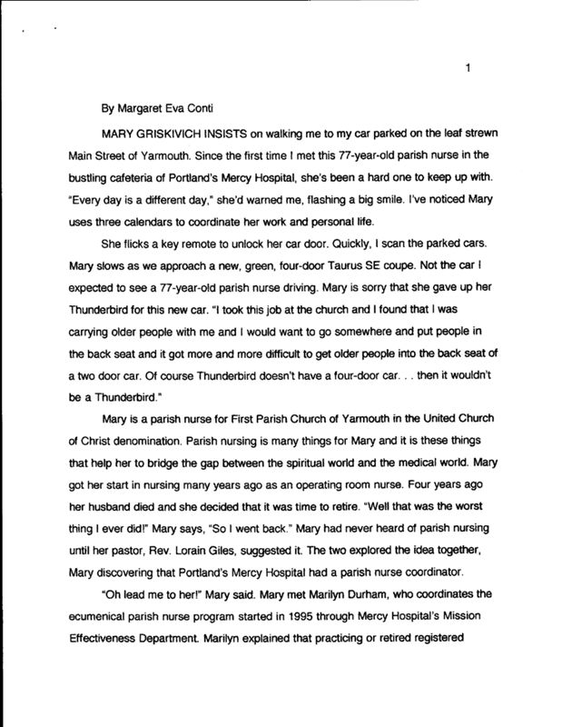 As a way to bridge the medical world and the spiritual world, serveral women became involved with a concept known as parish nursing. Margaret Conti highlights the lives of several women who perform duties as a parish nurse, showing their importance within their church community.