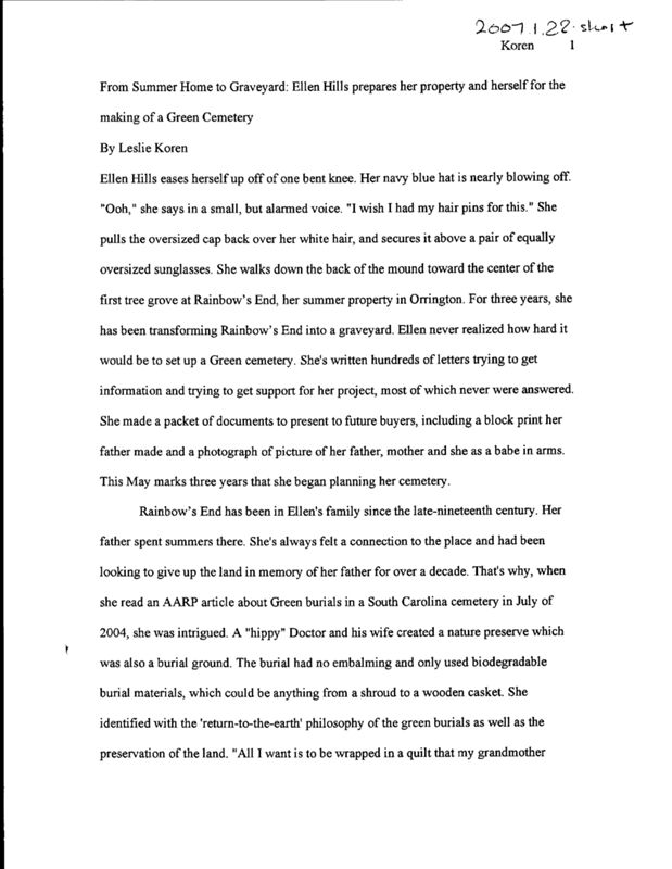 Intrigued by the concept of a cemetery that only conducts burials with biodegradable materials, Ellen Hills offered her summer property to be transformed into a graveyard. Leslie Koren speaks to Hills regarding her decision on the use of her land.