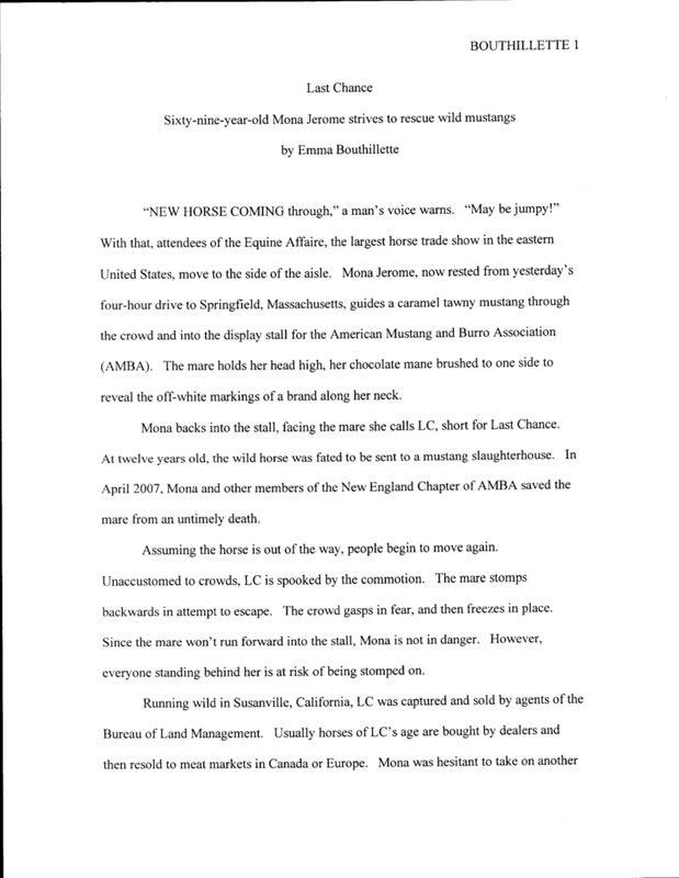 Having working with horses her entire life, Mona Jerome rescues wild mustangs and tries to find them new homes. Emma Bouthillette documents the work of Jerome, discussing her rescue organization and working with wild horses.