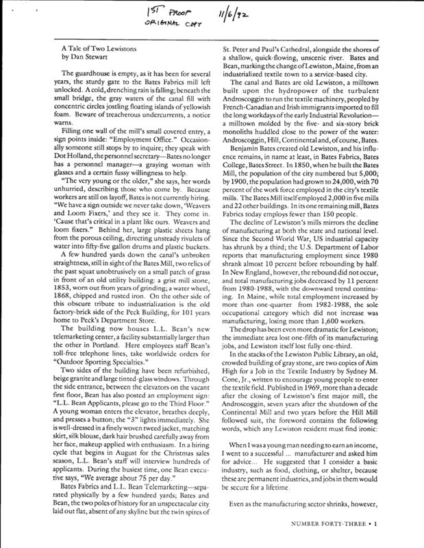 In Lewiston, Bates Fabrics and the L.L. Bean Telemarketing Center are only a few hundred yards from each other. Dan Stewart explores how these industries marks Lewiston as changing from an industrialized textile town to a service-based city.