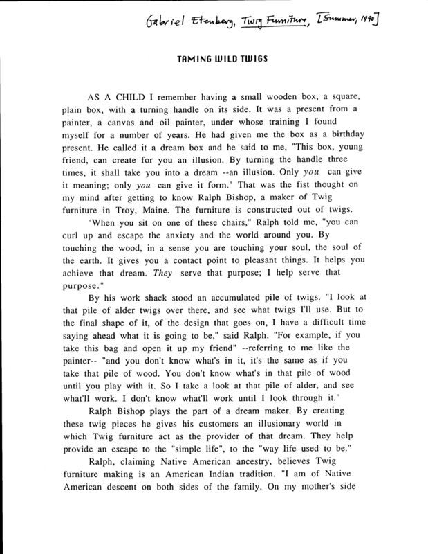 Gabriel Etenberg meets with individuals in Waldo County to learn about their craft of making furniture from twigs.