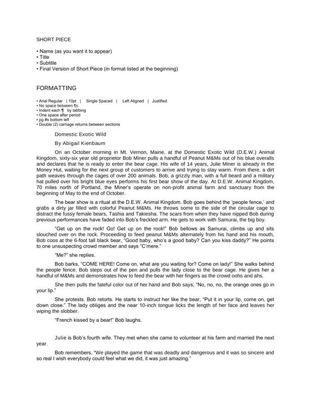 Abigail Kienbaum highlights the work of Bob and Julie Miner, owners and operators of their own wild and exotic animal farm in Mt. Vernon. Keinbaum speaks to the Miner's about starting their farm and the different kinds of animals they have there.