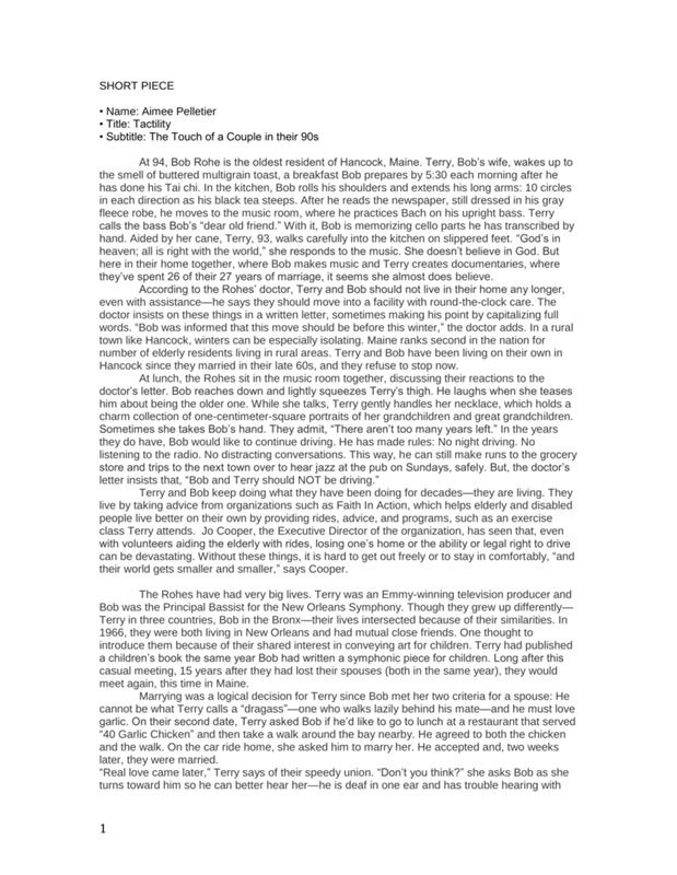 Aimee Pelletier highlights the lives of Bob and Terry Rohe, the oldest residents of town of Hancock. Pelletier discusses the Rohe's marriage and their way of life.