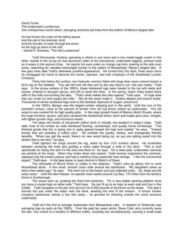 Mortgaging his home to start an own underwater logging company, Todd Morrissette started DeadHead Lumber Company, to search for lumber in the waters of Moosehead Lake. David Turner highlights the work that Morrissette puts into his company and the success that the company has found.