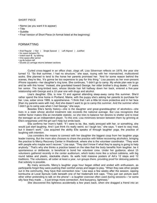Kira Goldenberg documents the work of Lisa Silverman, a recovering alcoholic and yoga leader who uses laughter in her sessions. Goldenberg speaks to Silverman about the history of alcholism in her family, how she fears her daught could follow the same path, and laughter yoga.
