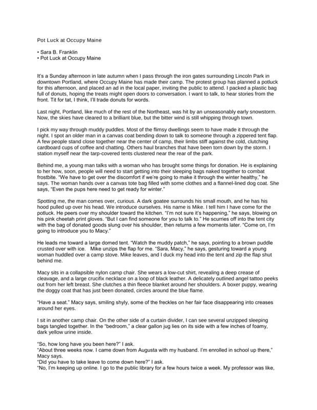 Sara Franklin highlights the life of Occupy Maine participants as they host a potluck supper. Franklin speaks to protests about the community they are building among each other.