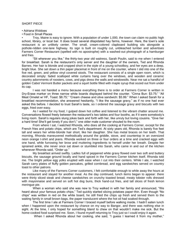 Adriana Widdoes highlights how in the small town of Troy, the Farmers Corner Restaurant creates some of the best homecooked food in all of Maine. Widdeos recounts her experience going to the restaurant on her way to Bangor and then returning for more.