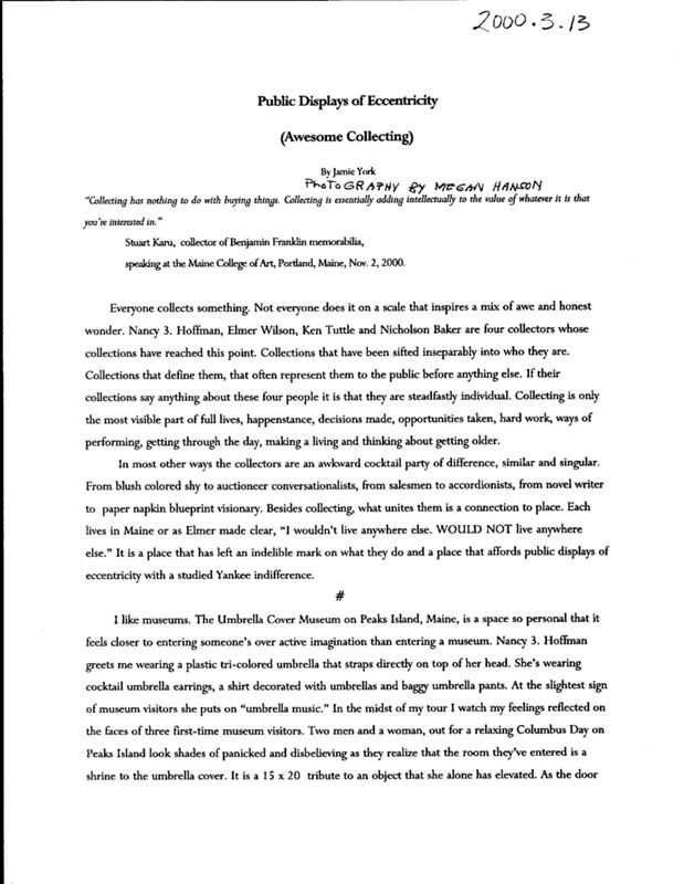 Jaimson York discusses the lives of several collectors, who collect different kinds of objects, but are united in their connection to place since they all live in Maine. York uncovers the differences among collectors and how they view their collections.