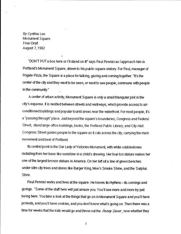 At the center of the city of Portland, Monument Square serves as the main location for Portland's political and economic activity. Cynthia Lee observes the activity around Monument Square to capture the essense of the downtown area.