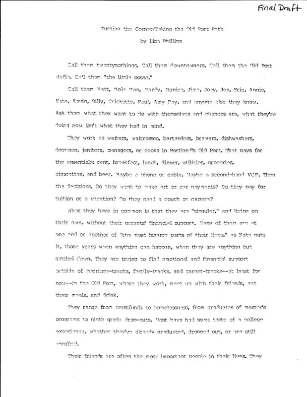 Employed in the the Old Port area of Portland are a group of waiters, waitresses, bartenders, brewers, dishwasers, janitors, managers and cooks who all share a common story. Lisa Philips discovers how these individuals live on their own without the support of their families, and how they spend their time in the Old Port area.