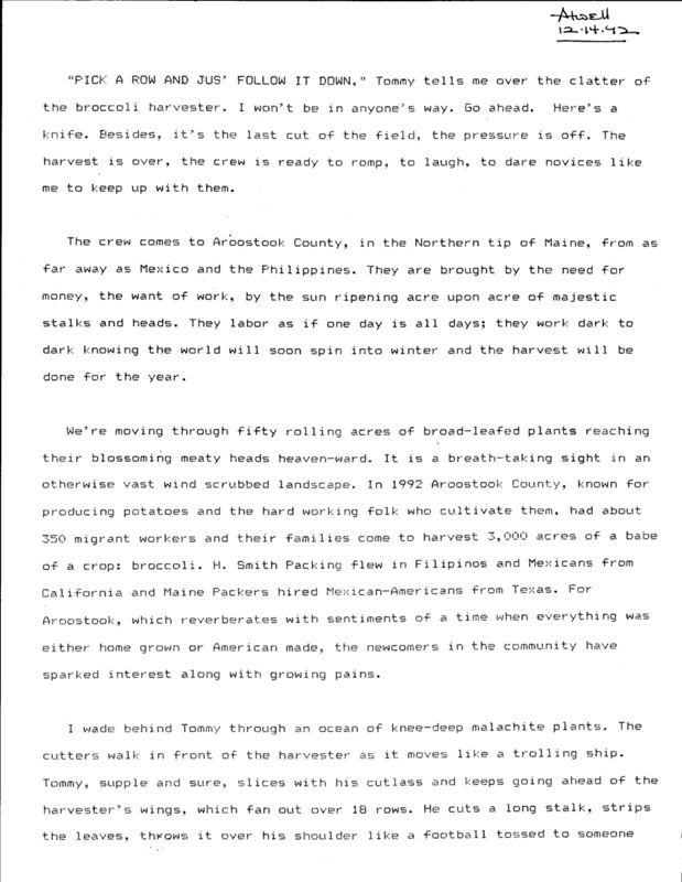 Kristin Atwell documents the lives of migrant workers from Mexico to the Philippines who come to Maine to harvest acres of broccoli. She explores how these newcomers to the Aroostook community brought forth interest, as well as some difficulties.