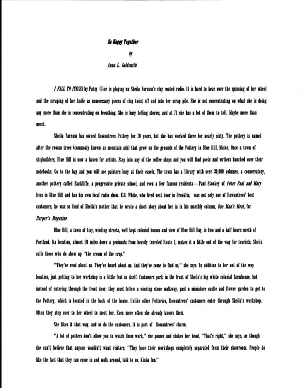 The creation of ceramic pieces is an art that potters take serious, generally not allowing people to watch them work. Anne Goldsmith watches and talks to potters at Rowantrees Pottery in Blue Hill to learn about their lives and their craft, uncovering the precise nature of their work.