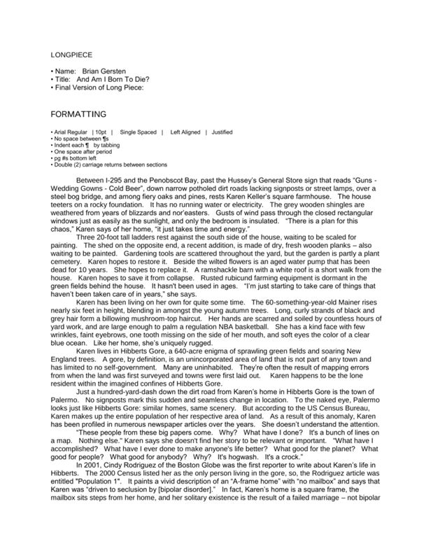 As the lone resident of Hibberts Gore, Karen Keller suffers from many different aliments, and has gone through mental and physical stresses over the years alone. Brian Gersten documents the life of Keller who suffers from cancer, Lyme disease, and mercury poisoning, discussing how she lives day-to-day.