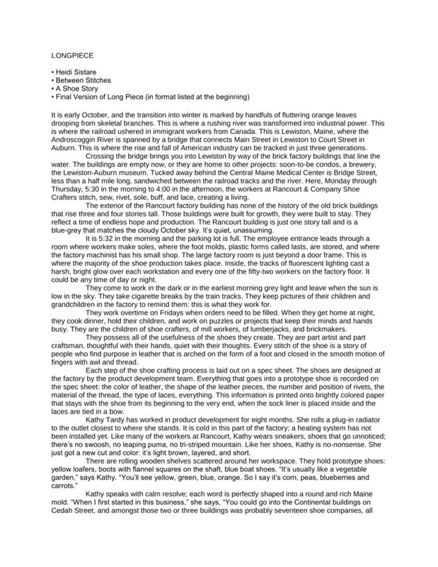 Despite social and economic changes, workers at the Rancourt factory in Lewiston continue the traditional craft of shoemaking. Heidi Sistare documents the work that is done at the factory and the importance of working at the shoe factory.