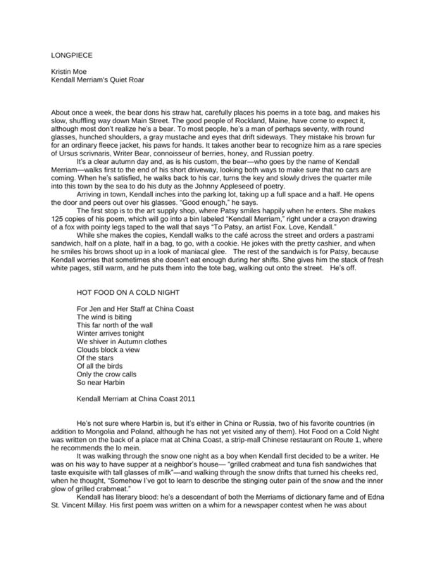 In the city of Rockland, the people know Kendall Merriam, a man who passes out poems to people each week. Kristin Moe documents the life of Merriam, a diagnosed paranoid schizophrenic, and discusses the subjects he covers in his poems.