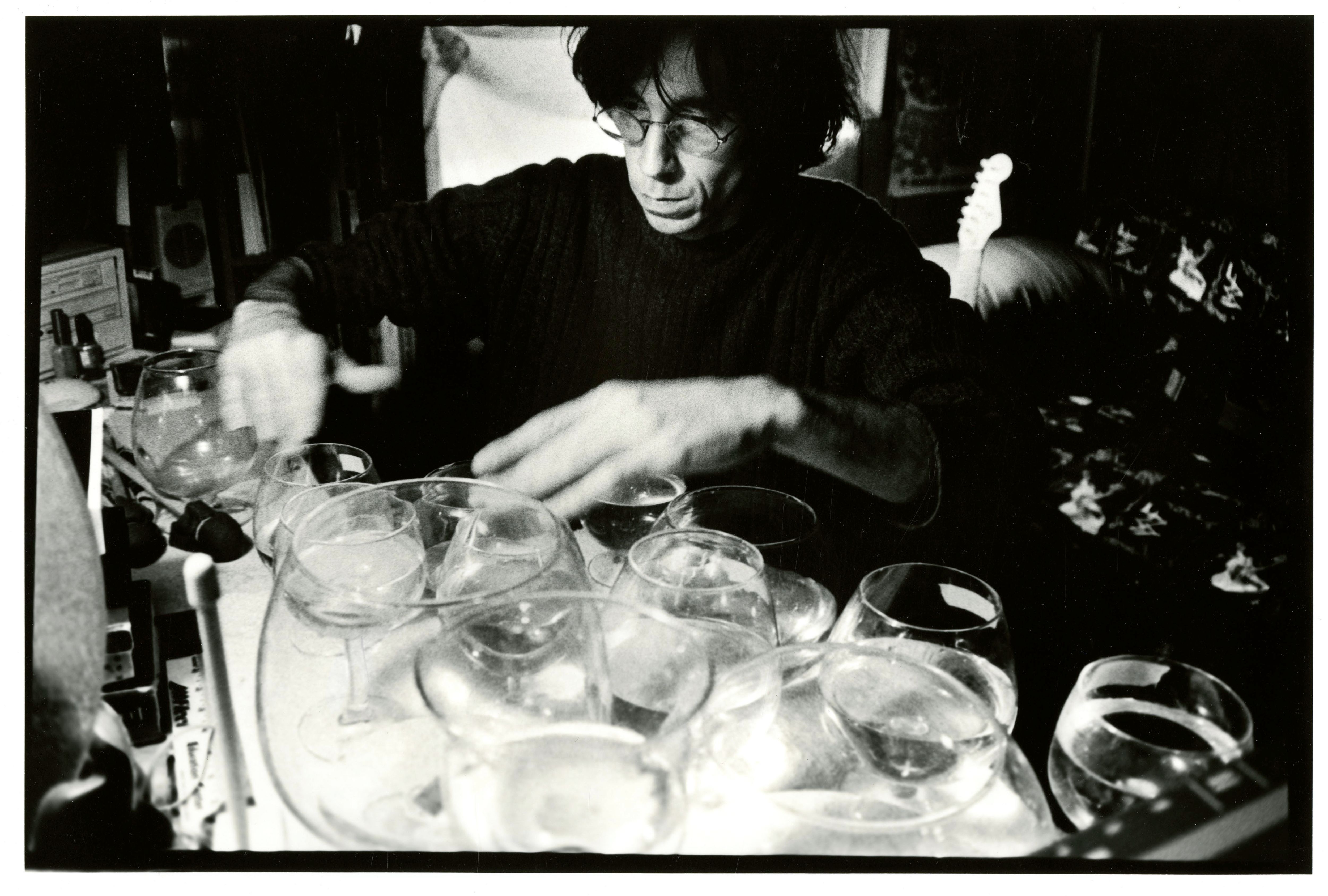 Renee Armstrong captures an image of Angus Maclaurin, a musician who experiments with recording sounds transmitted from glasswork.
