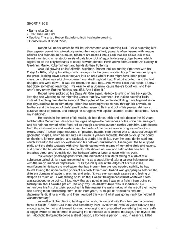 Through creating works of art, Robert Saunders is able to find a way to heal himself of his bipolar disorder. Aida Curtis highlights how the art that Saunders creates allows him to relax, and how art allows him to work through his mental condition.