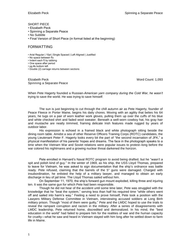 Elizabeth Peck documents the work of Peter Hagerty, founder of a Russian-American yarm company. Peck discusses how Peace Fleece was founded on the idea of "peace through trade," and as a way to fight back memories of Vietnam.