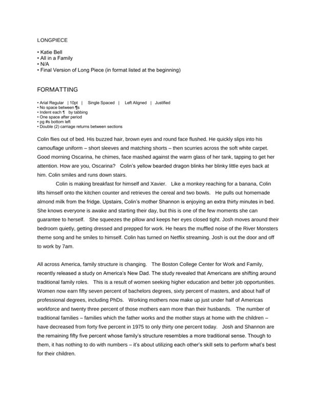 Shannon and Josh Gamache are a family who follow the traditional family structure, where Josh goes to work while Shannon stays at home raising the children. Katie Bell explores how the Gamache functions through the experiences of their eight year old, Colin.