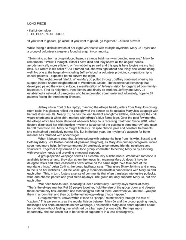 While facing an eight-year battle with multiple myeloma, Mary Jo Taylor received companionship from Jeffrey Wood, resulting in a great friendship and the creation of eHope. Kai Lindemulder documents the work done by Wood and other volunteers and caregivers who provide community and hope to patients facing life-threatening illnesses.