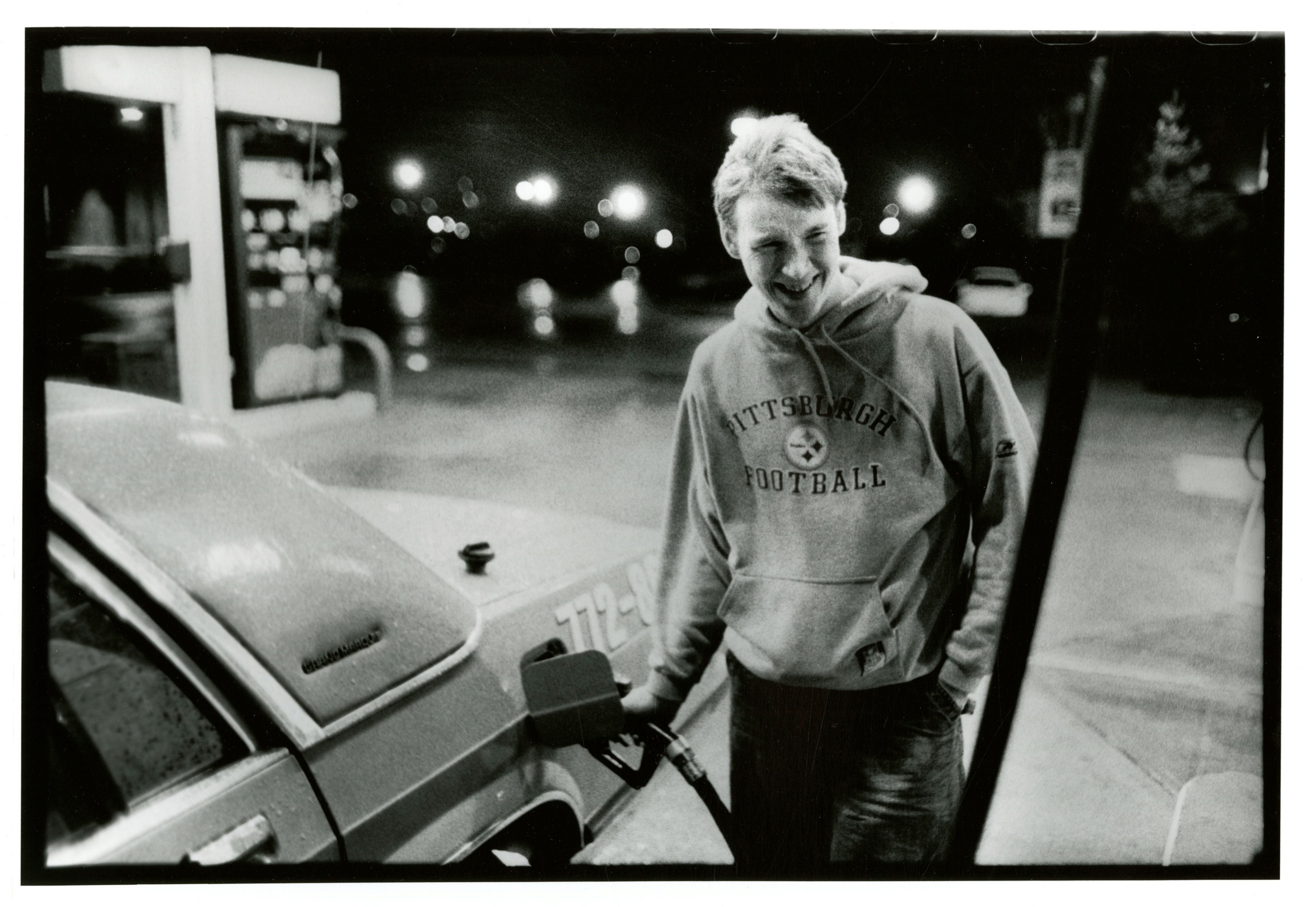 Randall Green captures a photograph of a young man putting gas into his car.