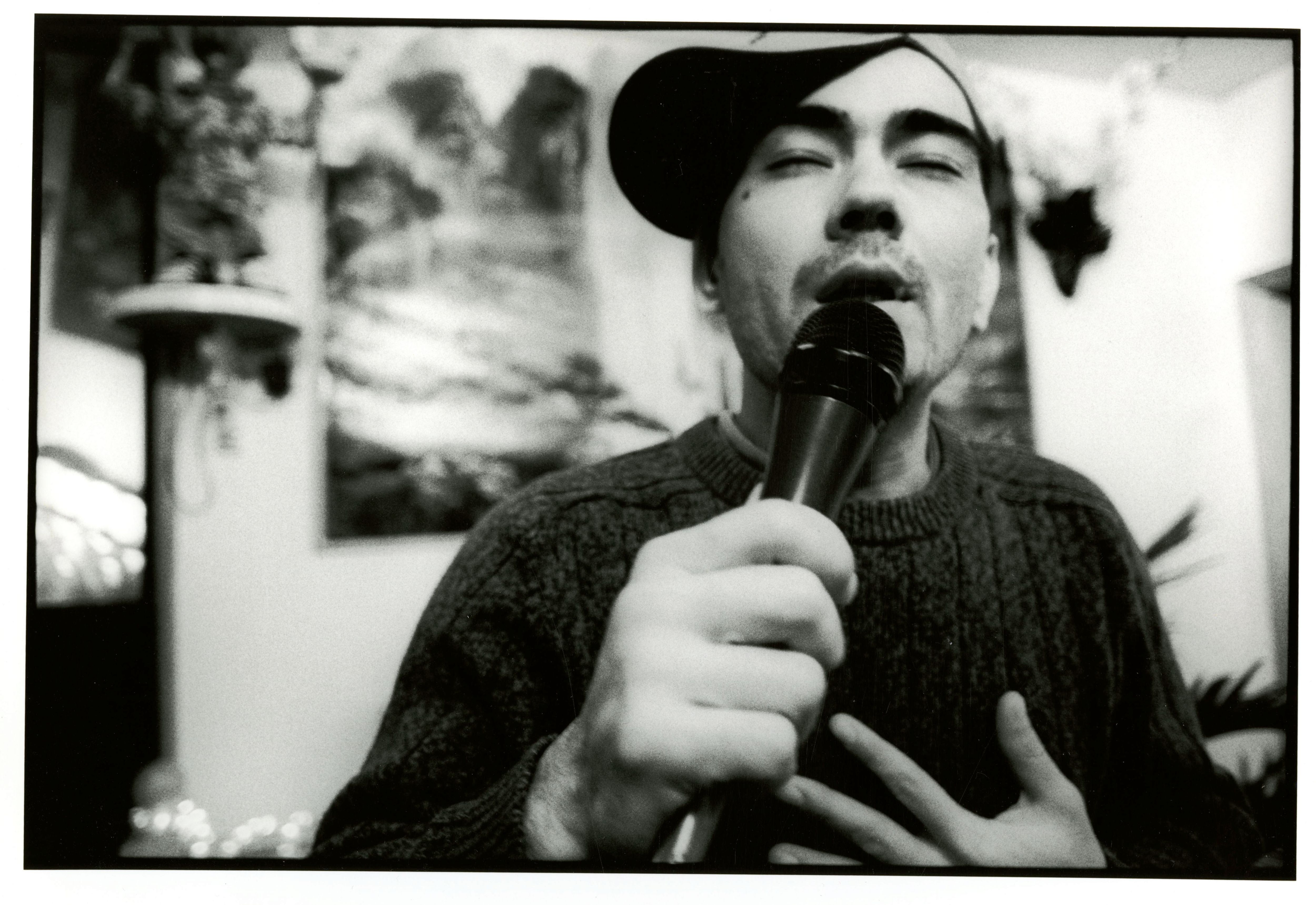 Cullen Schneider captures a photograph of a man singing into a microphone at L.H. Karaoke Lounge in Portland, Maine.