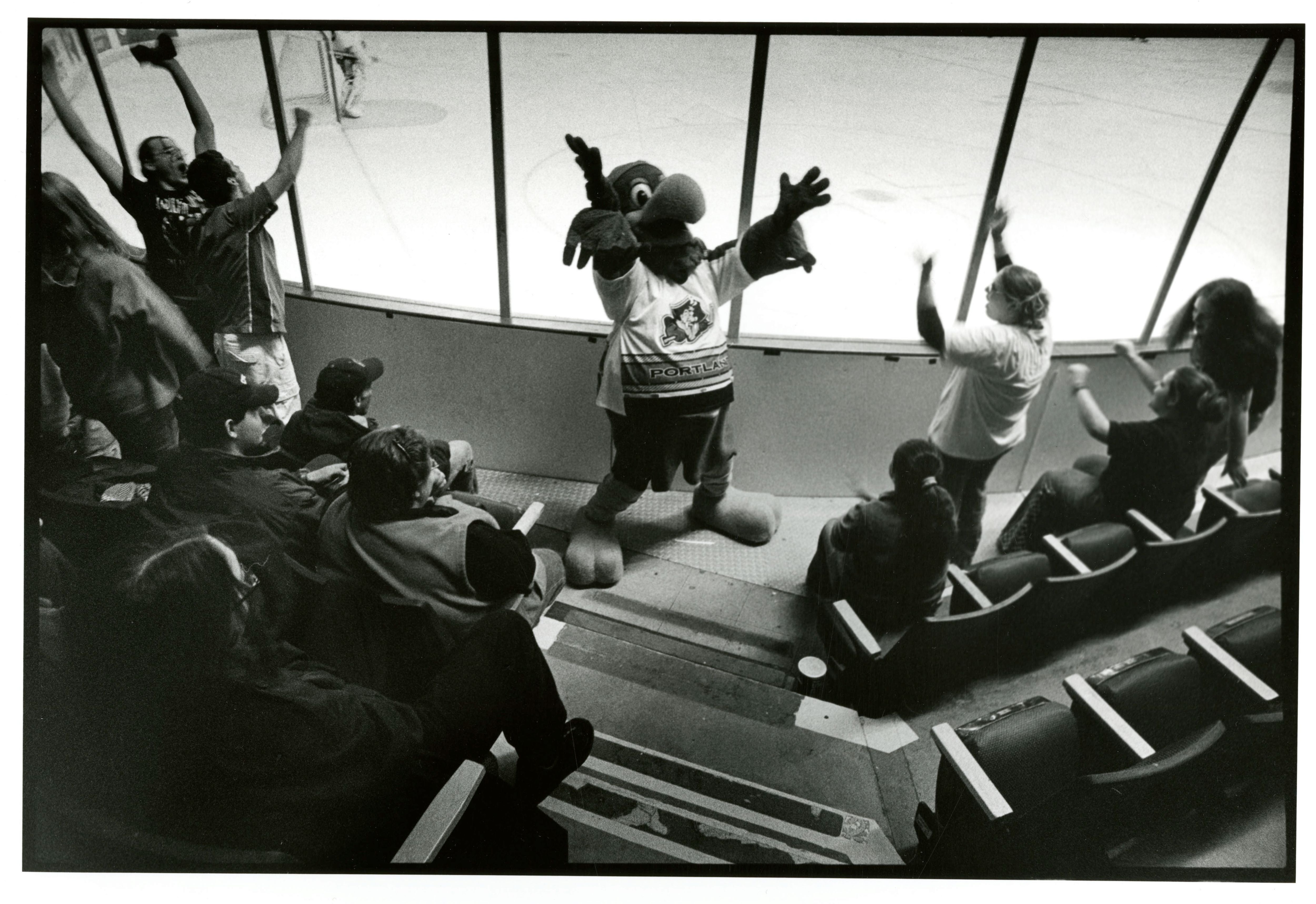 Erika Preuss captures a photograph of Crackers, the Portland Pirates' mascot, leading the crowd in celebrating a good play on the ice.