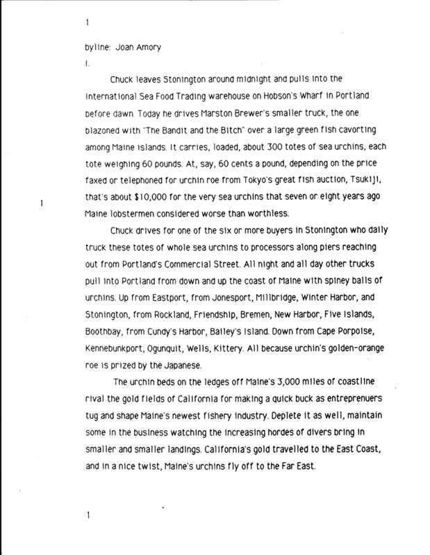 In Portland, the sea urchin industry represents an opportunity for individuals of all backgrounds to have a job working on the waterfront. Joan Amory explores how lucrative this business is for individuals in Portland.