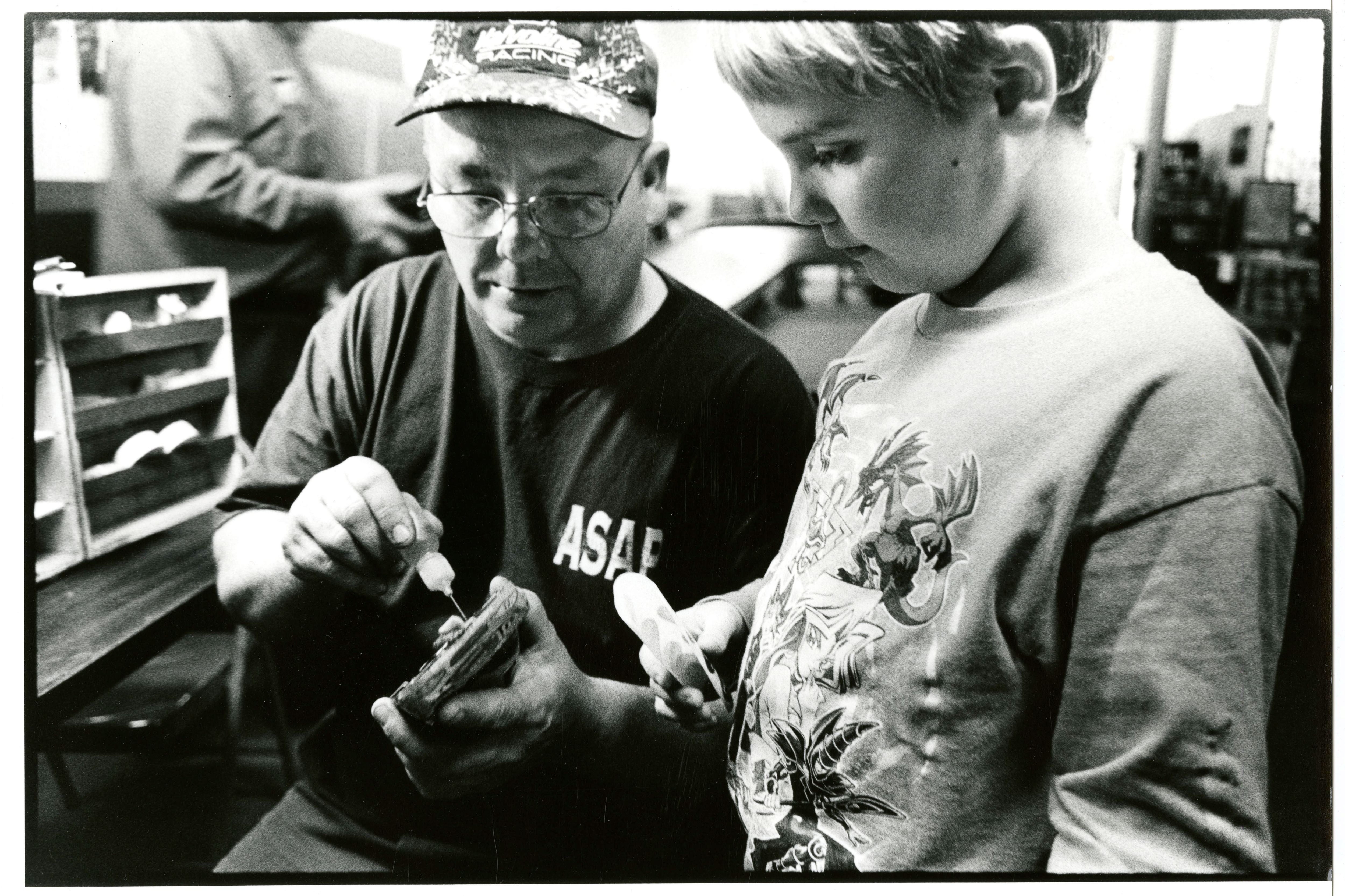Allison Lucas captures a photograph of a man showing a boy a slot car.