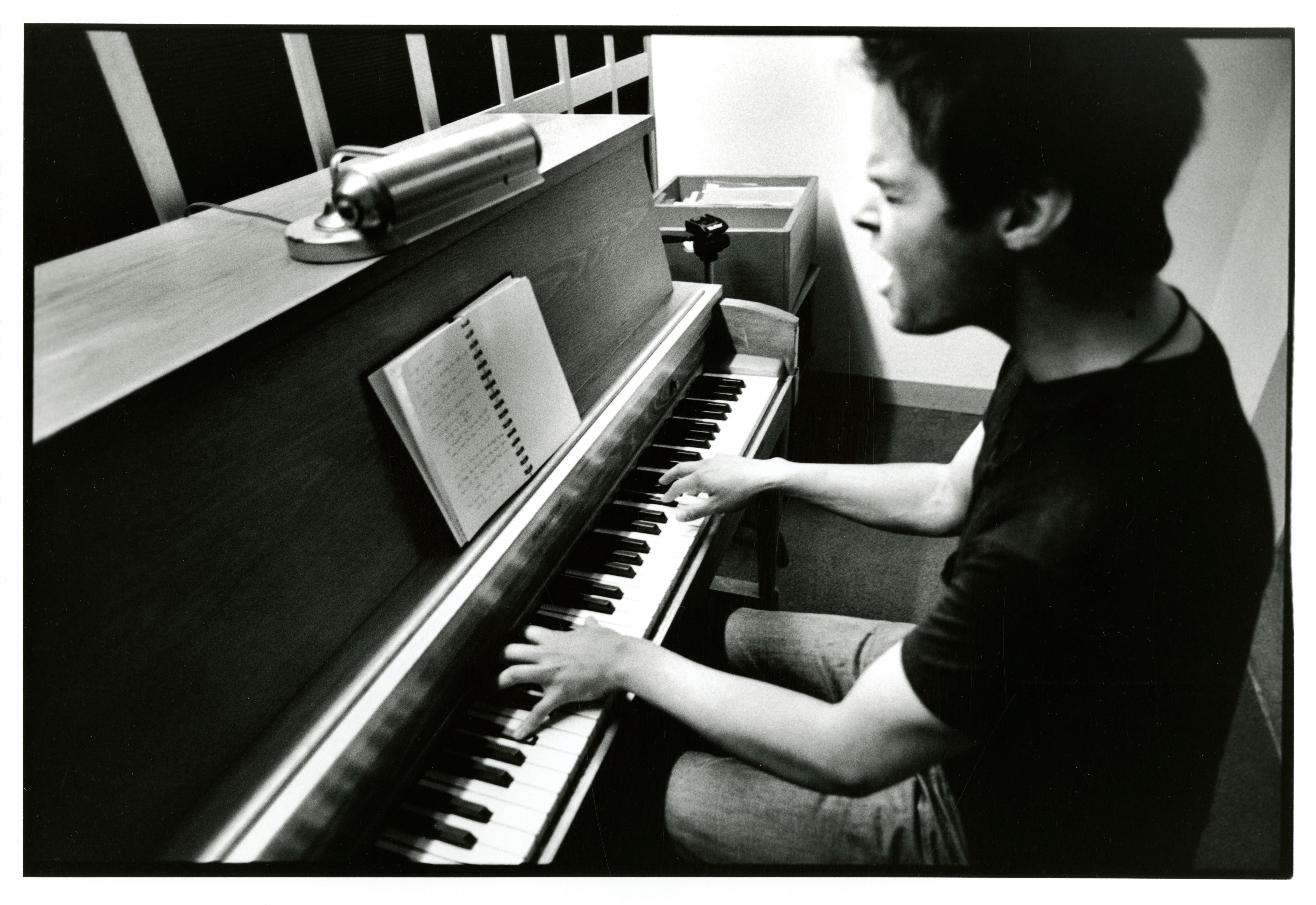 Cecilia Duchano captures a photograph of Matt Araujo playing an upright piano and singing in a room at the Portland Public Library.