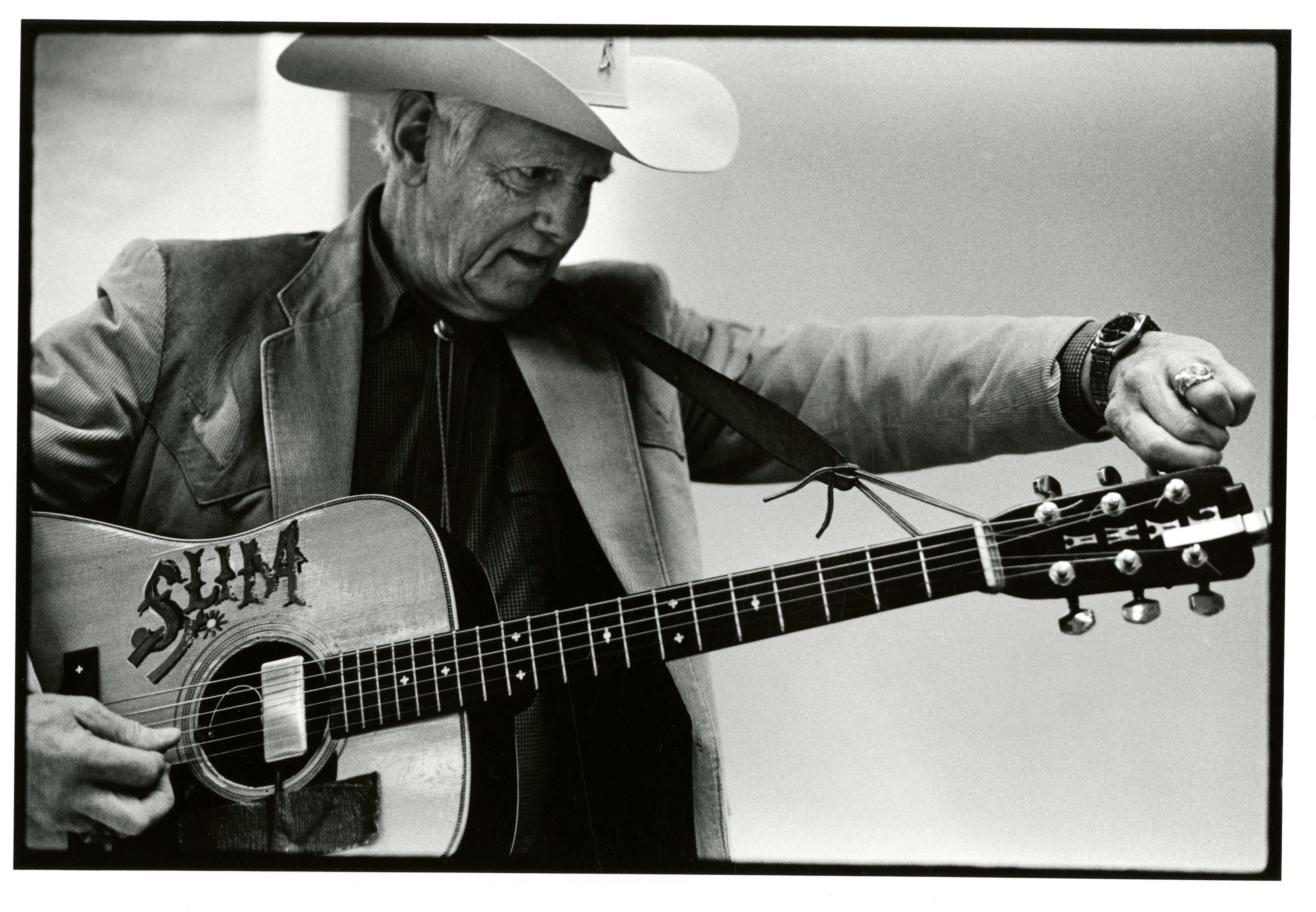 Hannah Fox captures a photograph of Slim Andrews tuning his guitar at the American Legion in Westbrook, Maine.
