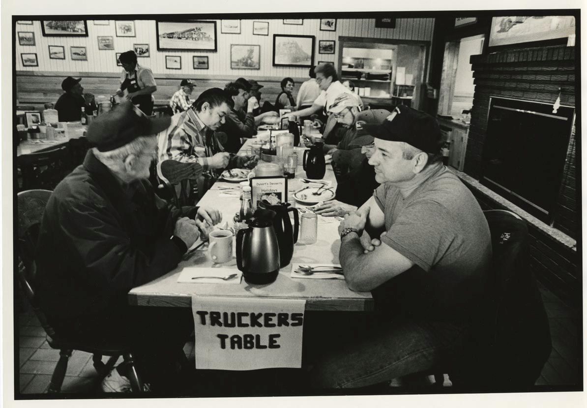 Molly Myers captures a photograph of men sitting at a long truckers' table as a waitress attends to men at the far end.