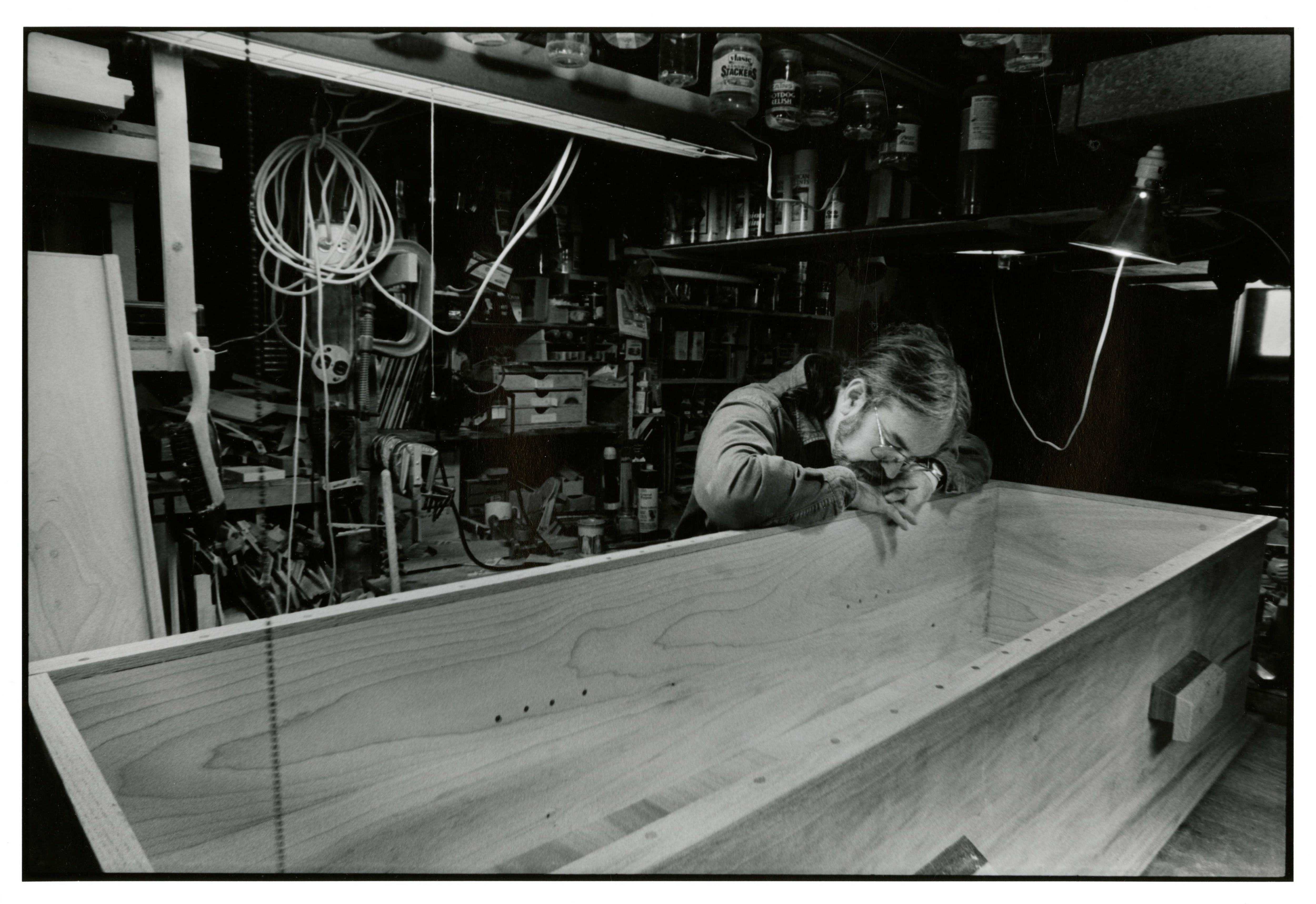 Annie Reichert captures a photograph of Michael Luce in his basement workshop, looking into the coffin he is building for his recently deceased mother, Portland, Maine.