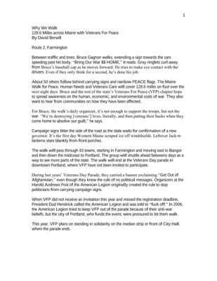 David Bersell documents the efforts of the Maine Walk for Peace, Human Needs and Veterans Care, a group that will cover 128.6 miles by foot to raise awareness on the human, economic, and environmental costs of war. Bersell highlights the work done by Veterans For Peace during the walk.