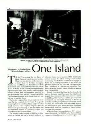 Although Great Diamond Island spans over 400 acres of land in Casco Bay, the island is split into two sides, leading to different ways the residents of the island view themselves. Bogart Salzberg investigates the two "sides" of the island to learn more about the island communities on Great Diamond Island.