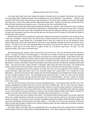 With the recession of the late 2000s, many paper mills in Maine were closed down, including the Otis Speciality Papers Mill in the town of Jay. Rob Korobkin explores how residents of the town are coming together to support each other, and discusses how the town's current social dynamics are shaped by a labor union strike from the 1980s.
