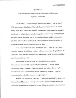 Having working with horses her entire life, Mona Jerome rescues wild mustangs and tries to find them new homes. Emma Bouthillette documents the work of Jerome, discussing her rescue organization and working with wild horses.